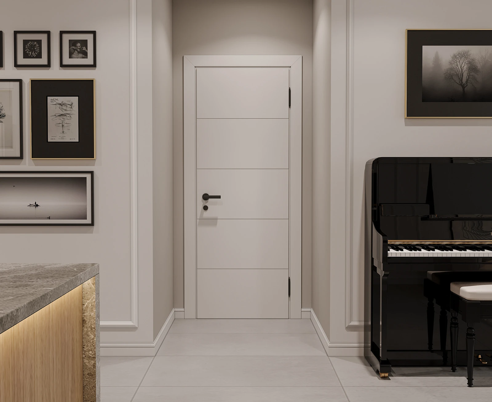 Дверное полотно, коробка, наличник на две стороны, петли, магнитный замок, уплотнитель, ригель (для двустворчатых конфигураций)