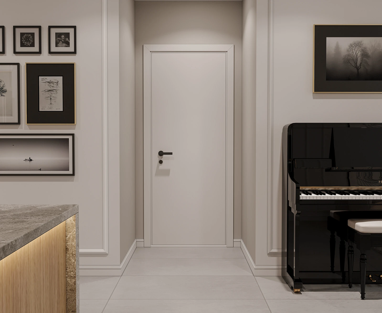 Дверное полотно, коробка, наличник на две стороны, петли, магнитный замок, уплотнитель, ригель (для двустворчатых конфигураций)