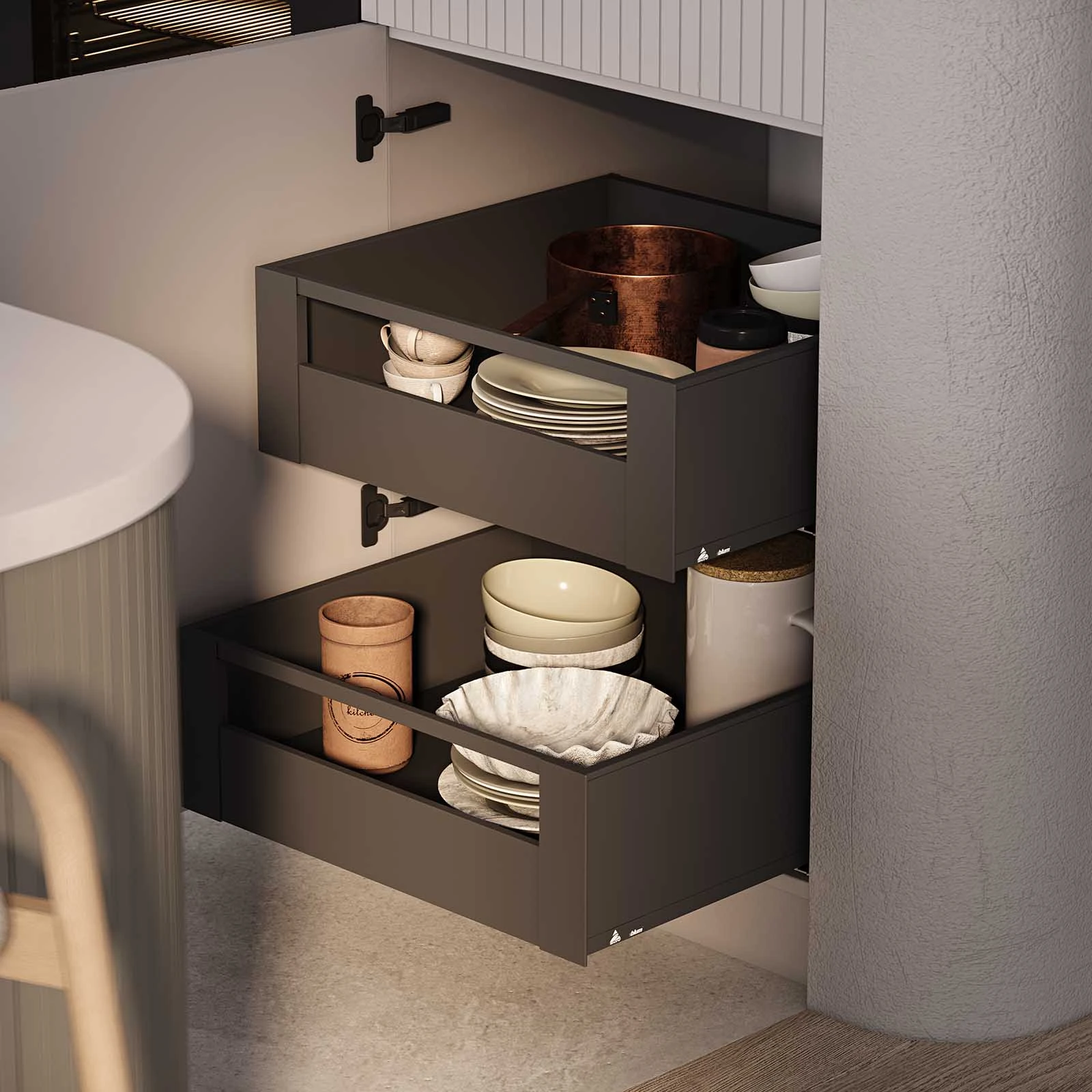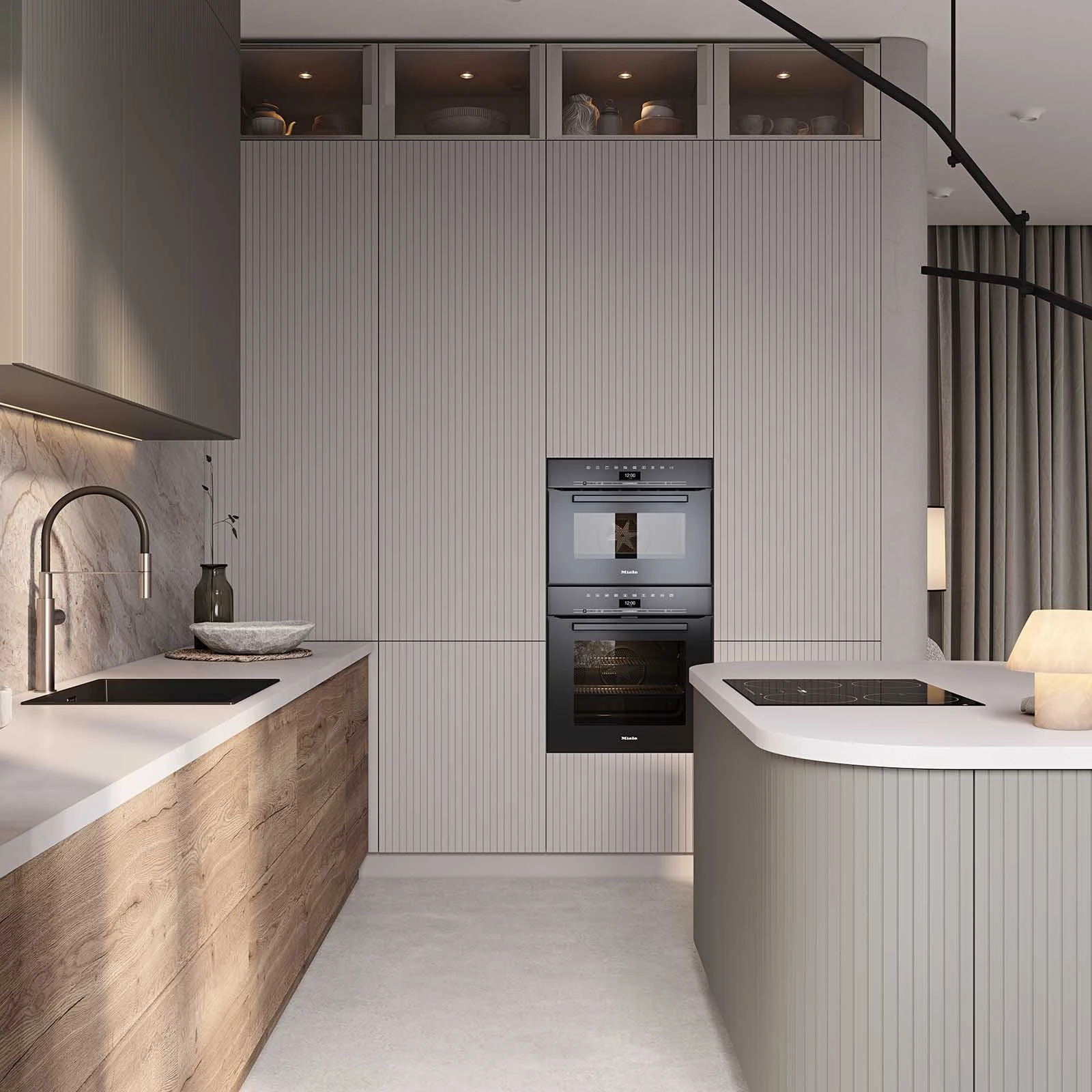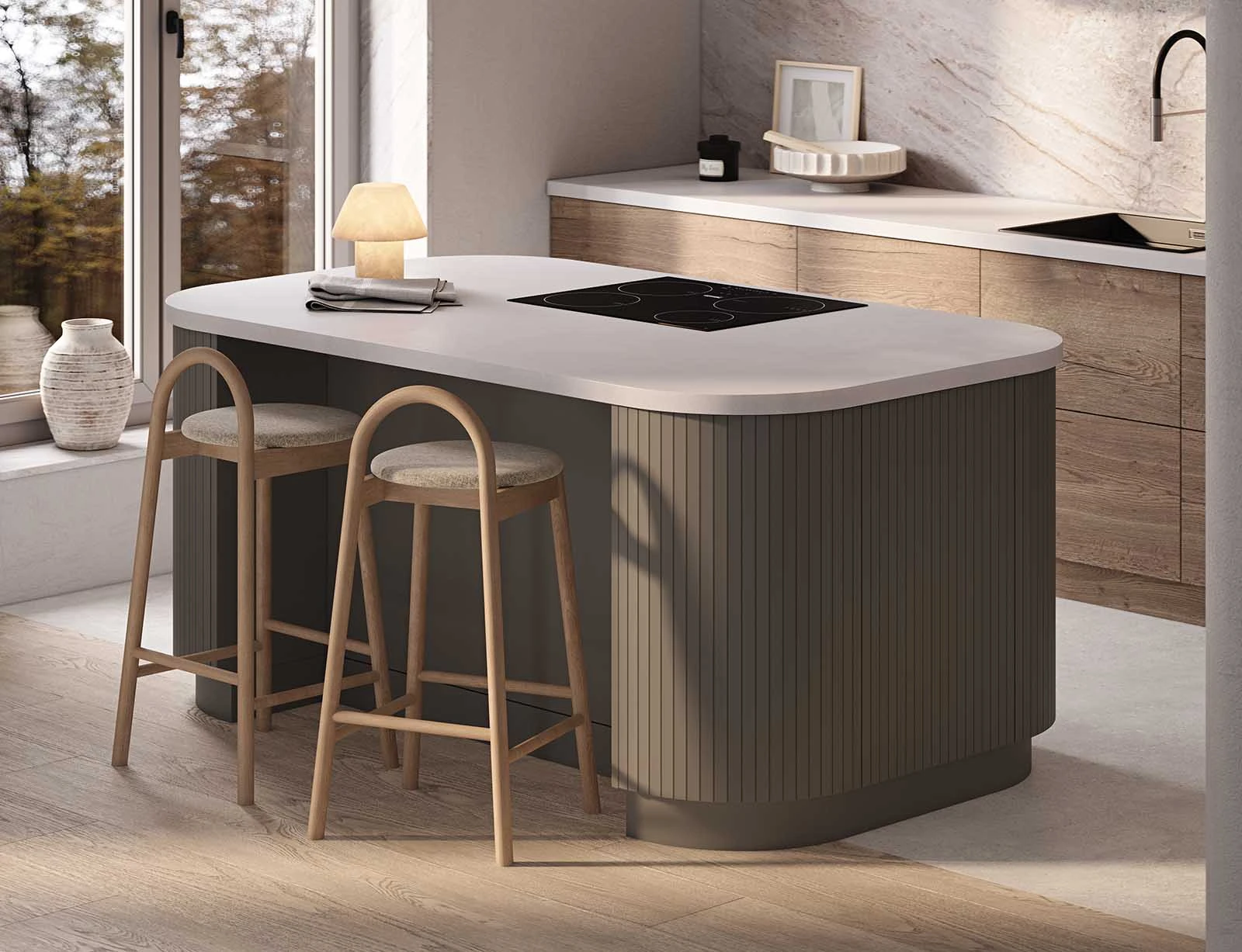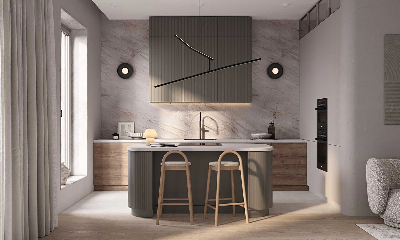 ФАСАДЫ Аврора (крашеная МДФ), цвет NCS S 5005-G50Y / S 1500-N Матовый; ЛМДФ Тимбер, декор Рока СТОЛЕШНИЦА Пластик HPL, 38 мм