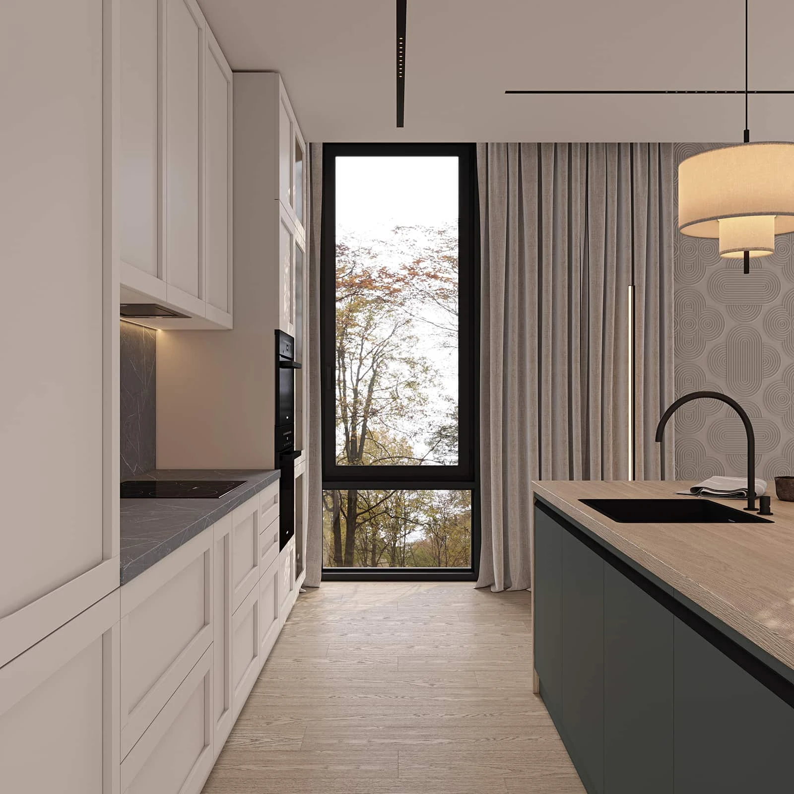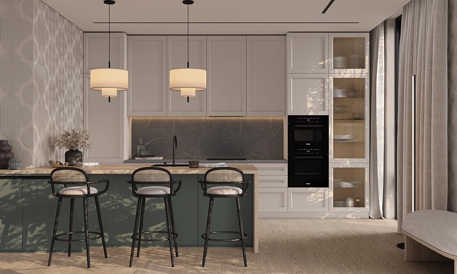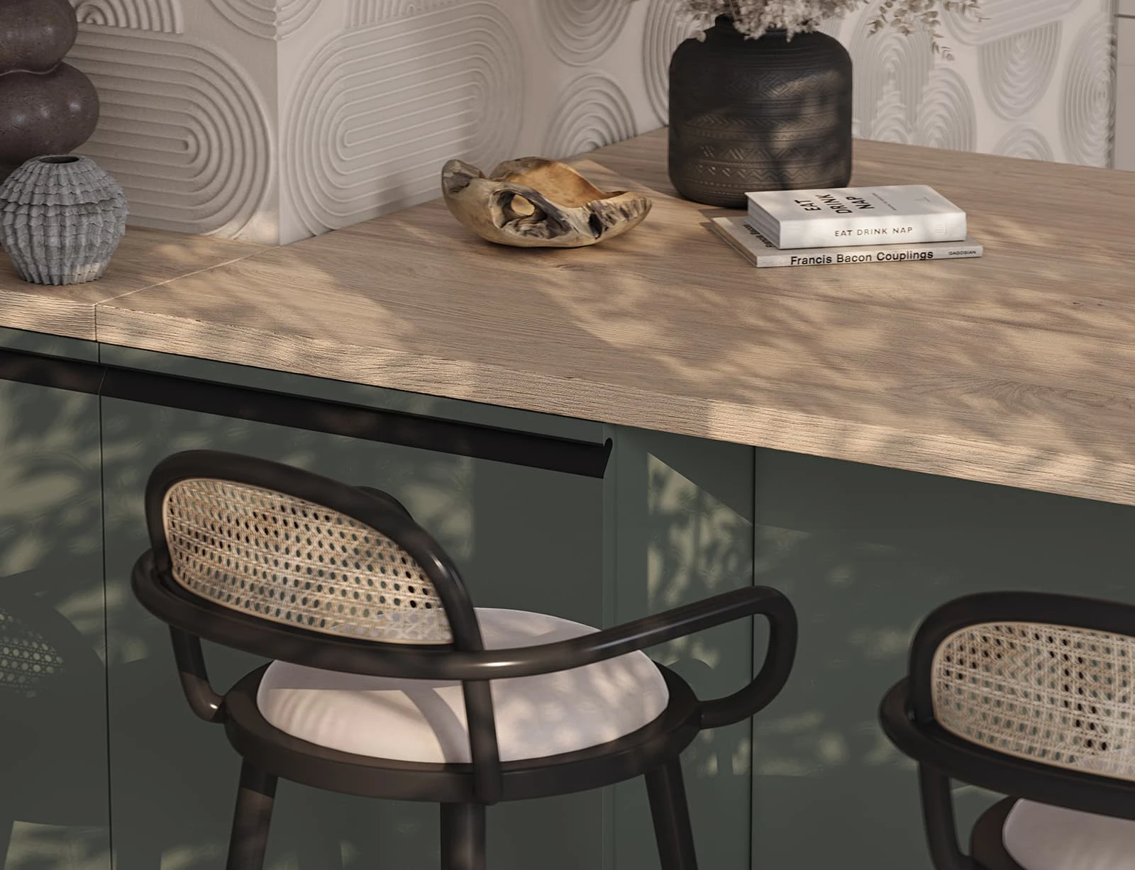 ФАСАДЫ Т368 Натуральная ольха, цвет NCS S 1500-N / акрил Fenix NTM, цвет Зеленый NTM (0750) СТОЛЕШНИЦА Пластик HPL, 38 мм / КС массив дуба, 38 мм, цвет #189 (воскобейц Белый)