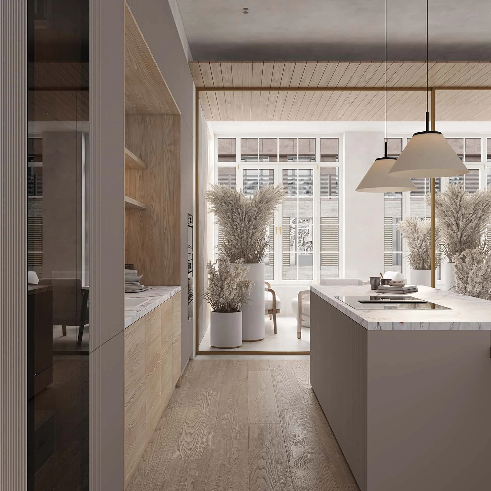 ФАСАДЫ Т645 Крашеная МДФ, цвет NCS S 2000-N Матовый / Т419Г Шпон дуба, цвет #189 (воскобейц Белый) СТОЛЕШНИЦА Пластик HPL, 38 мм, декор Версаль / КС массив дуба, 38 мм, цвет #189 (воскобейц Белый)