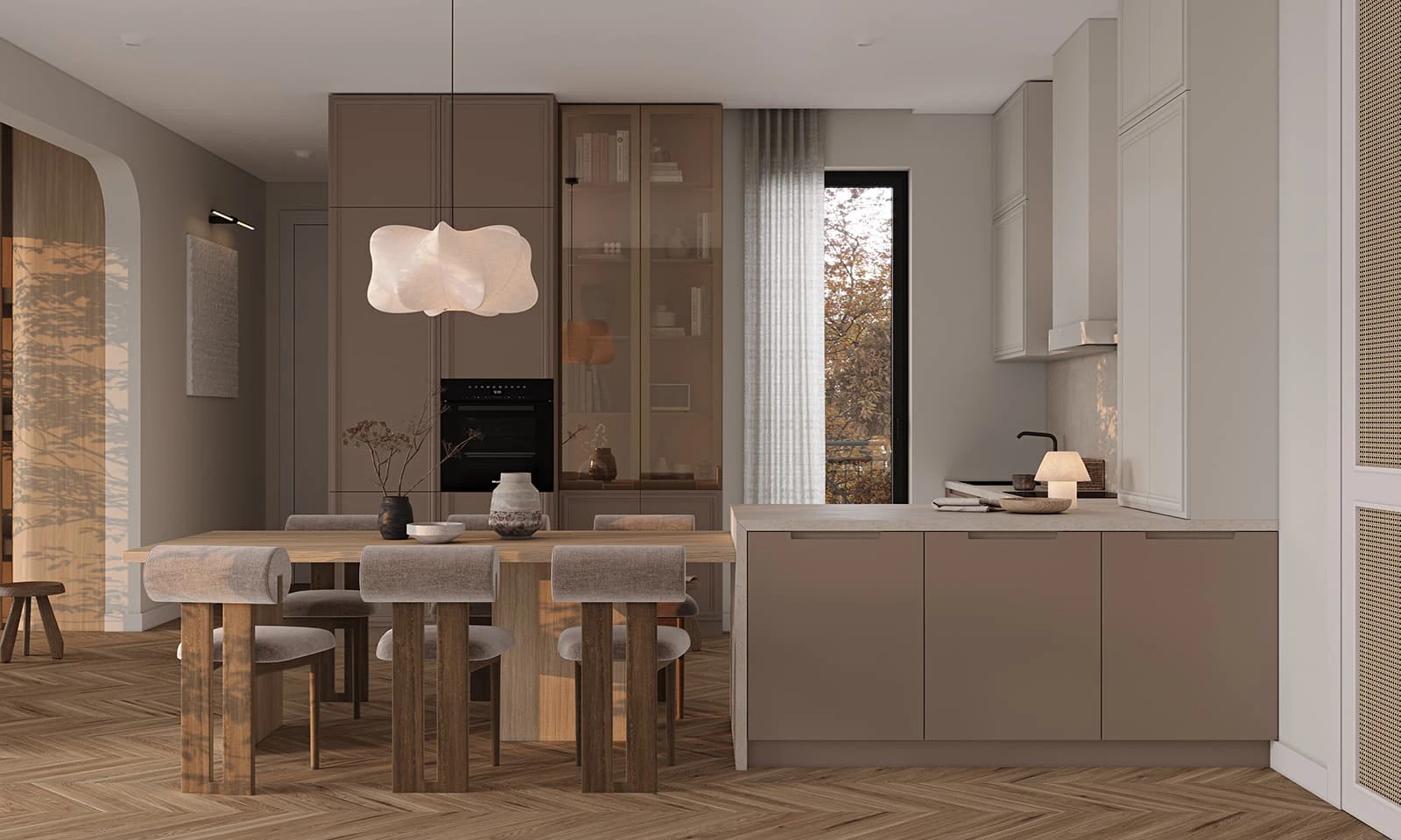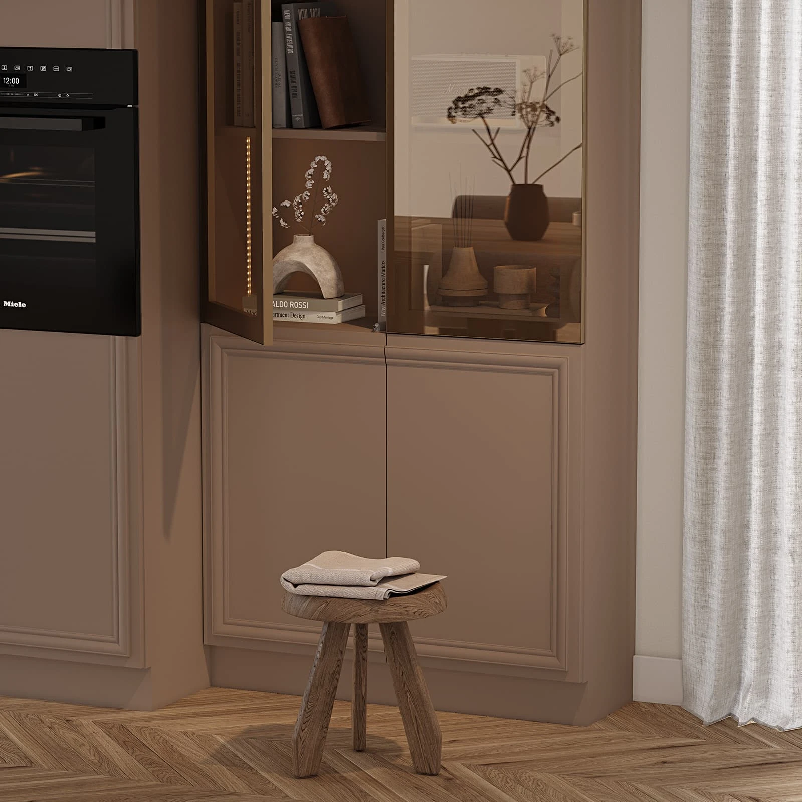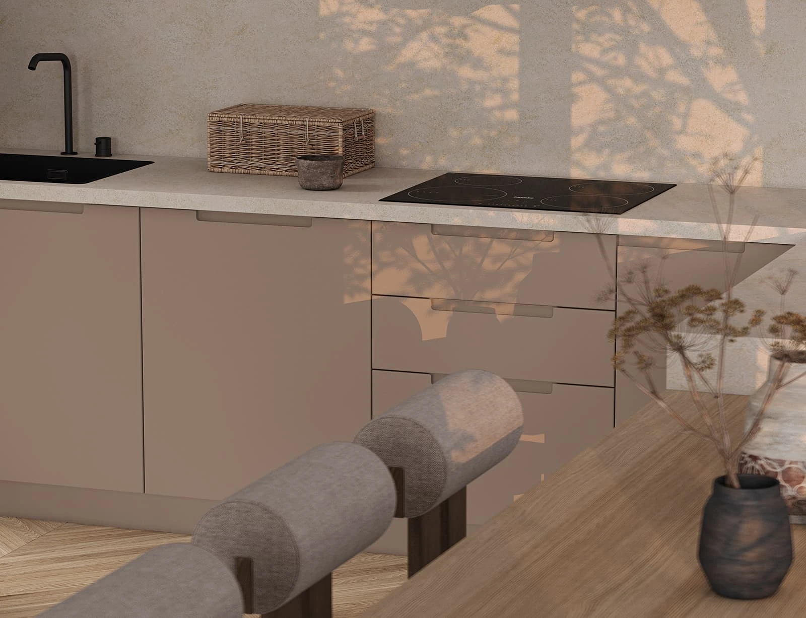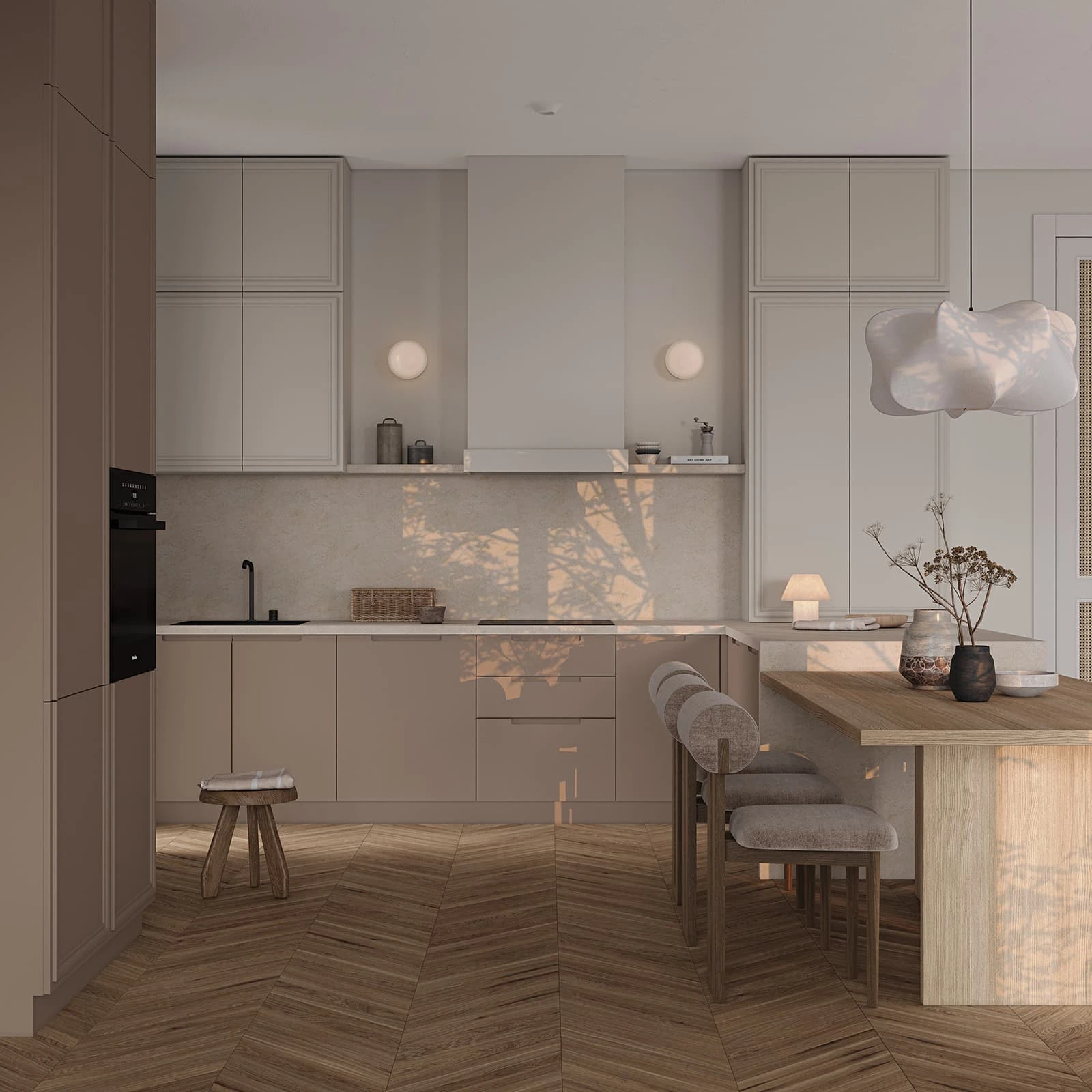 ФАСАДЫ Т622 Крашеная МДФ, Т649 Крашеная МДФ, цвет NCS S 5005-Y50R Матовый / NCS S 1500-N Матовый СТОЛЕШНИЦА Пластик HPL, 38 мм / КС массив дуба, 38 мм, цвет #183 (масловоск Бесцветный)