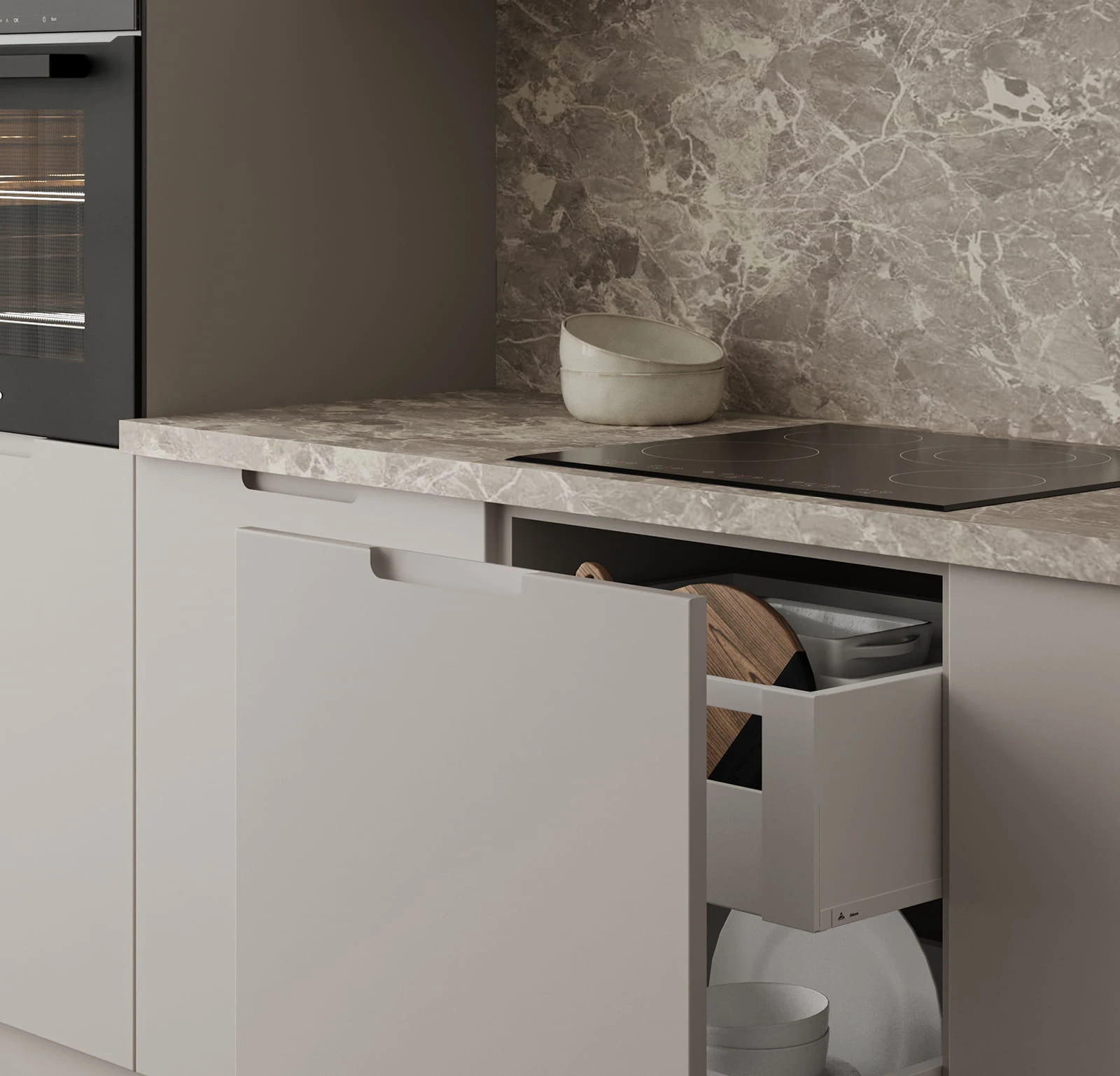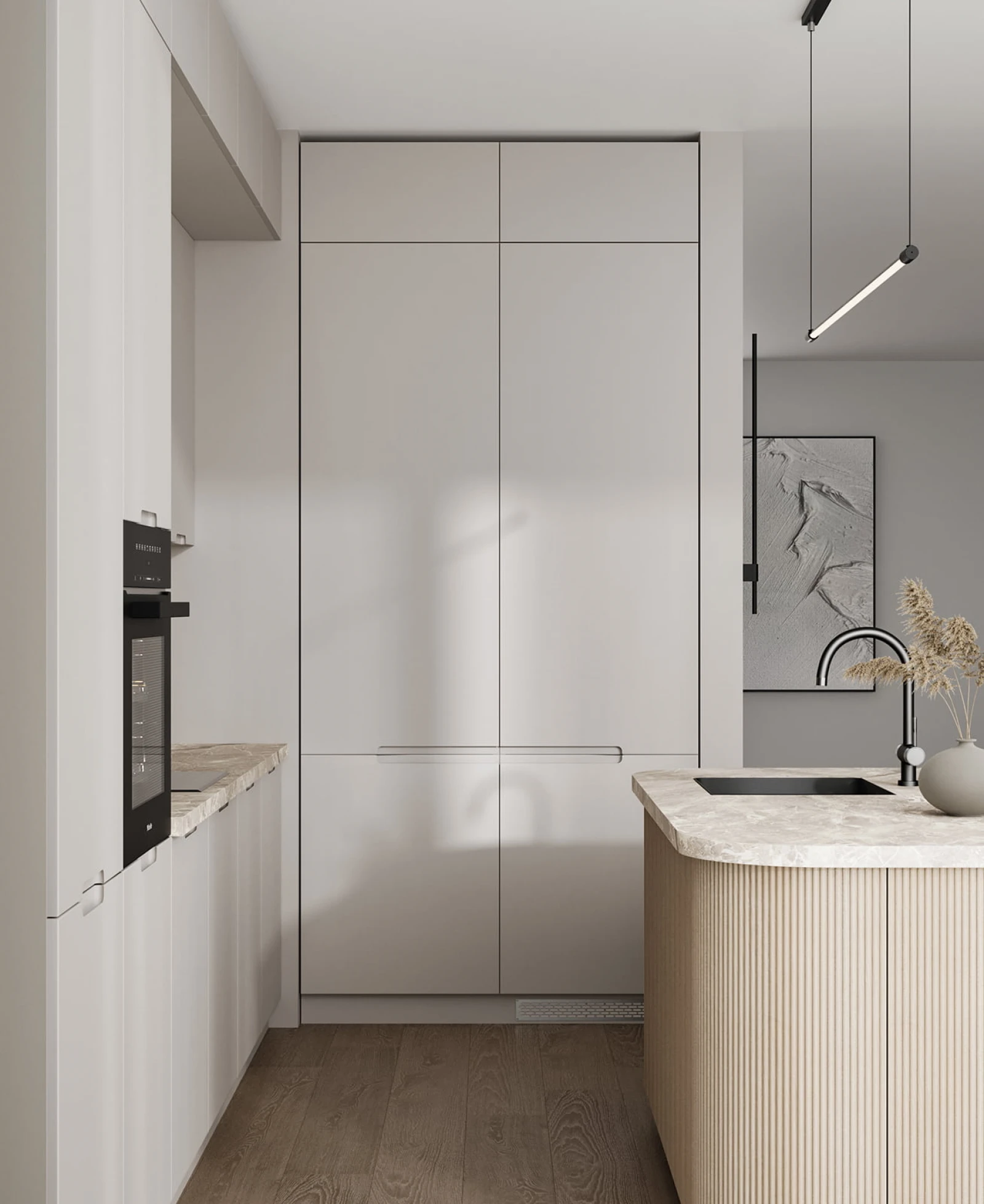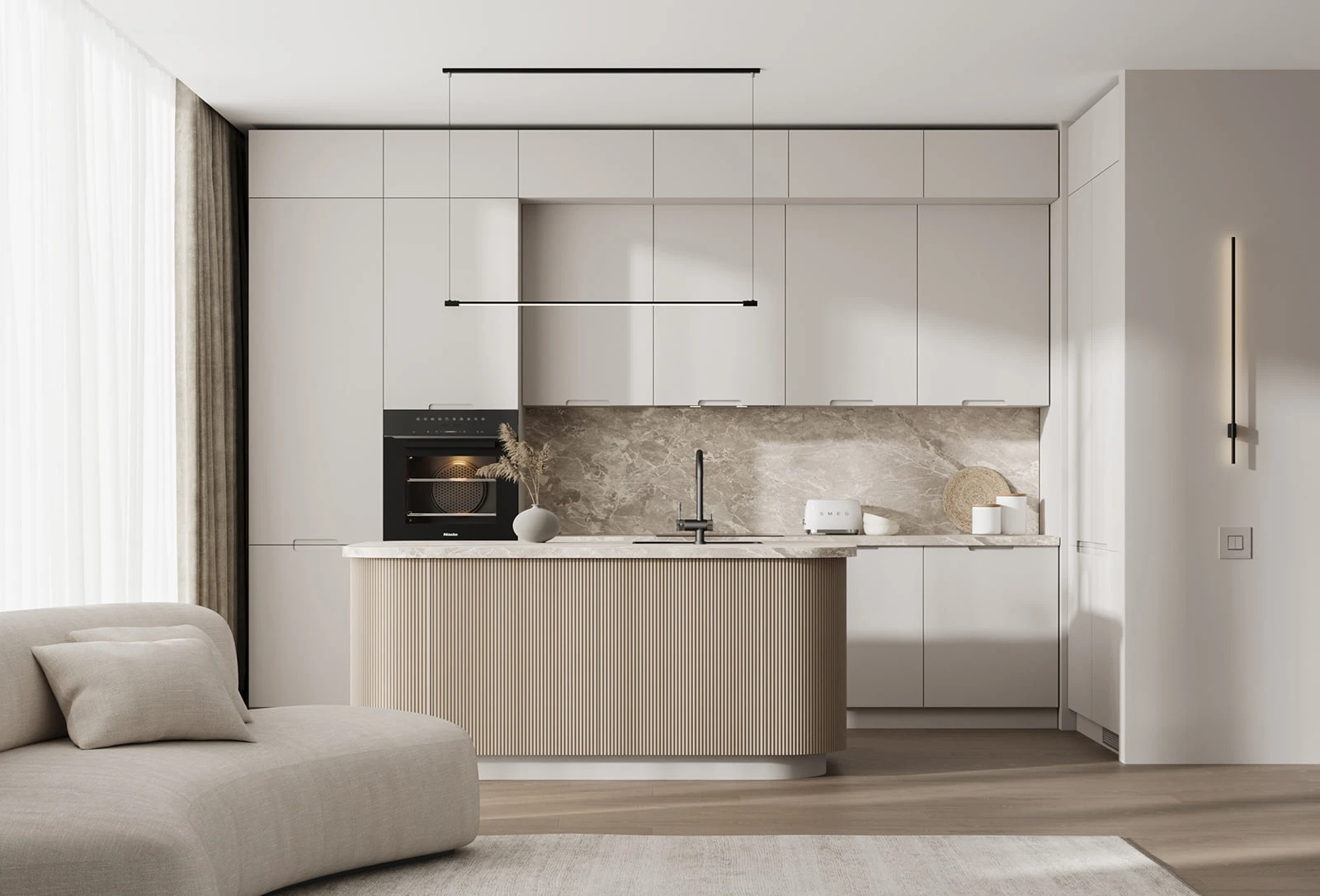 ФАСАДЫ Т622 Крашеная МДФ, цвет NCS S 1502-Y Матовый; T430 Массив дуба / шпон дуба, цвет #189 (воскобейц Белый) СТОЛЕШНИЦА Пластик HPL, 38 мм, декор Римский Камень
