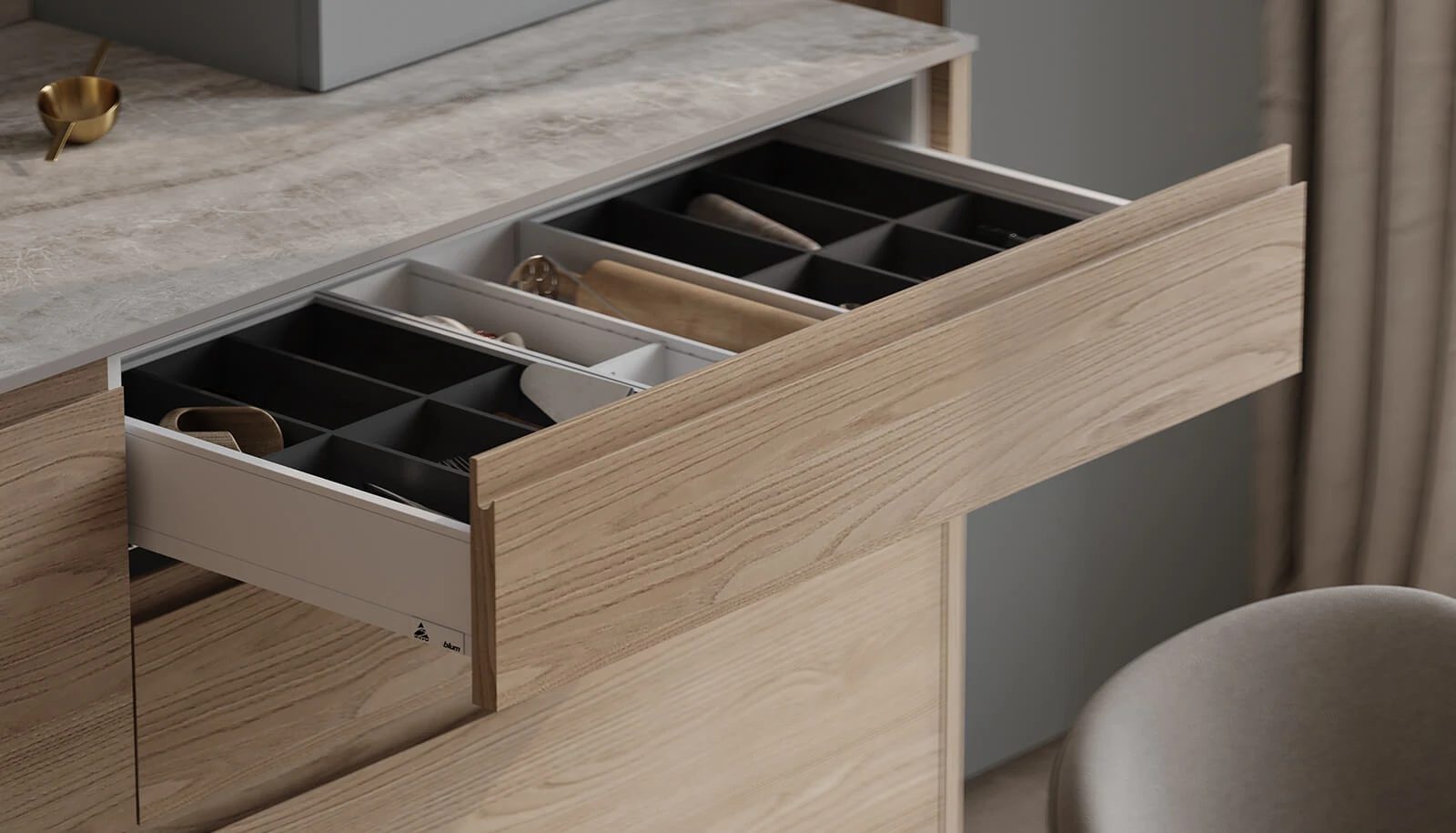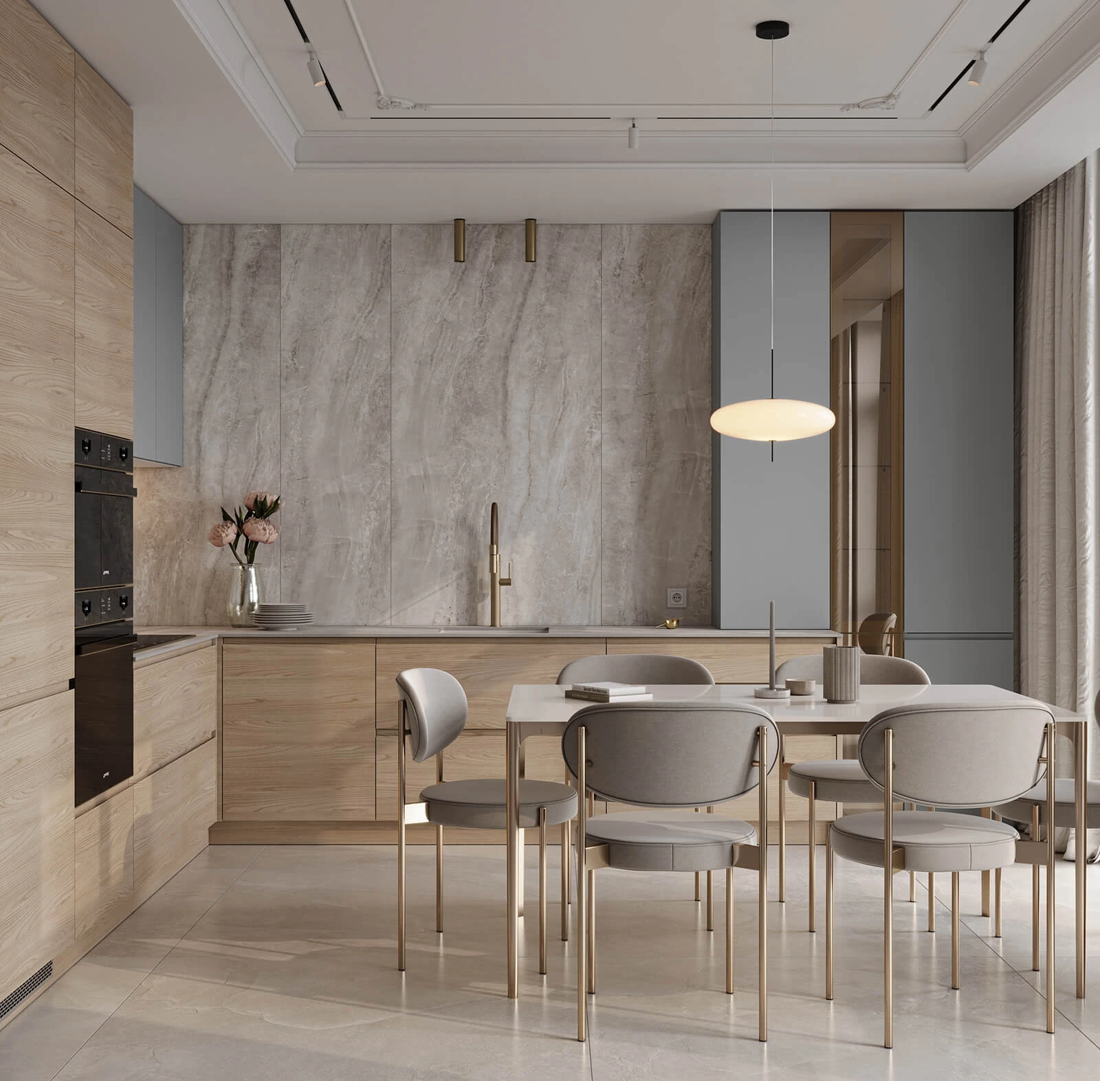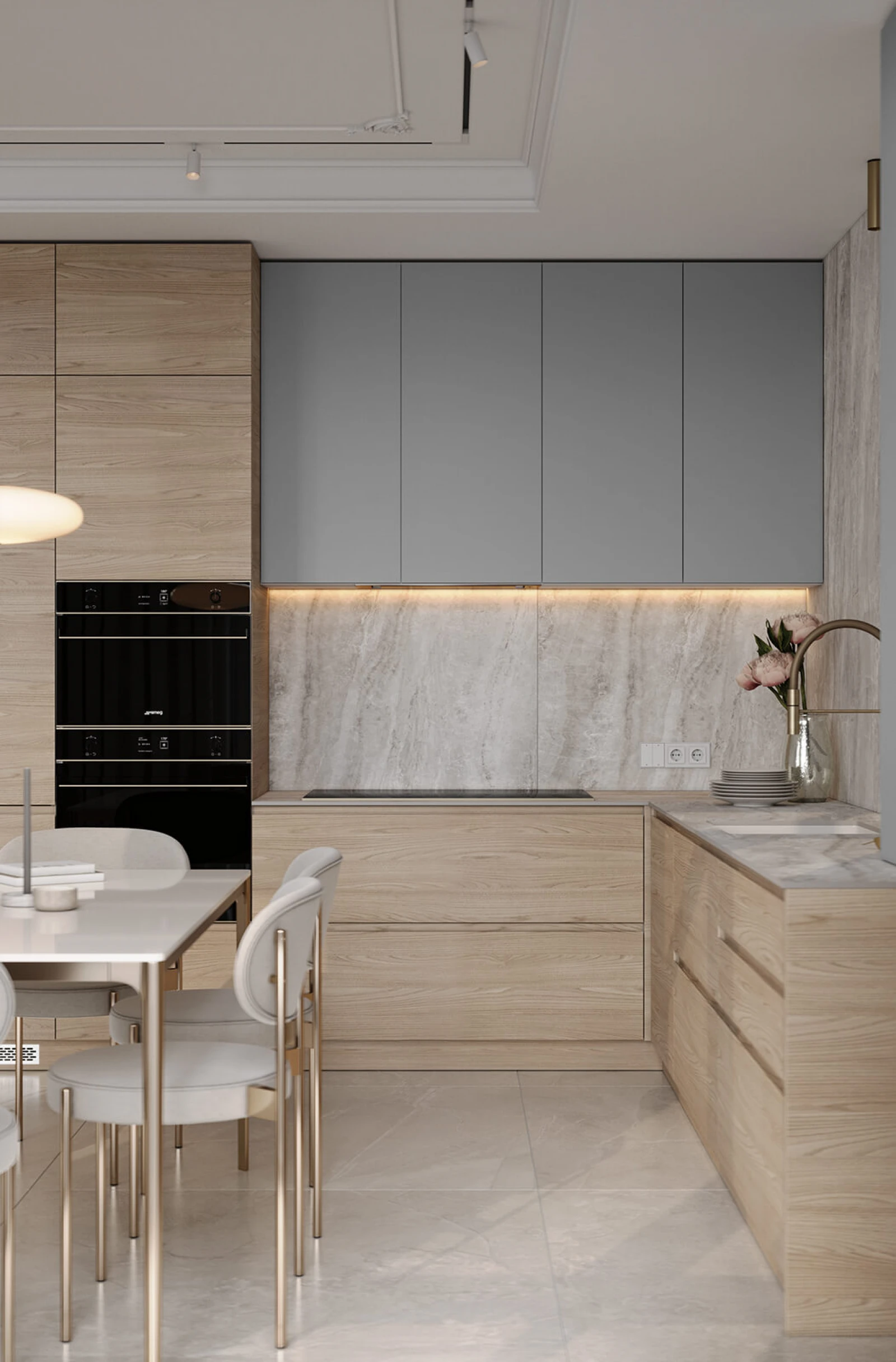 ФАСАДЫ Крашеная МДФ, цвет NCS S 3005-B20G Матовый / T222 Шпон ясеня, цвет #189 (воскобейц Белый)