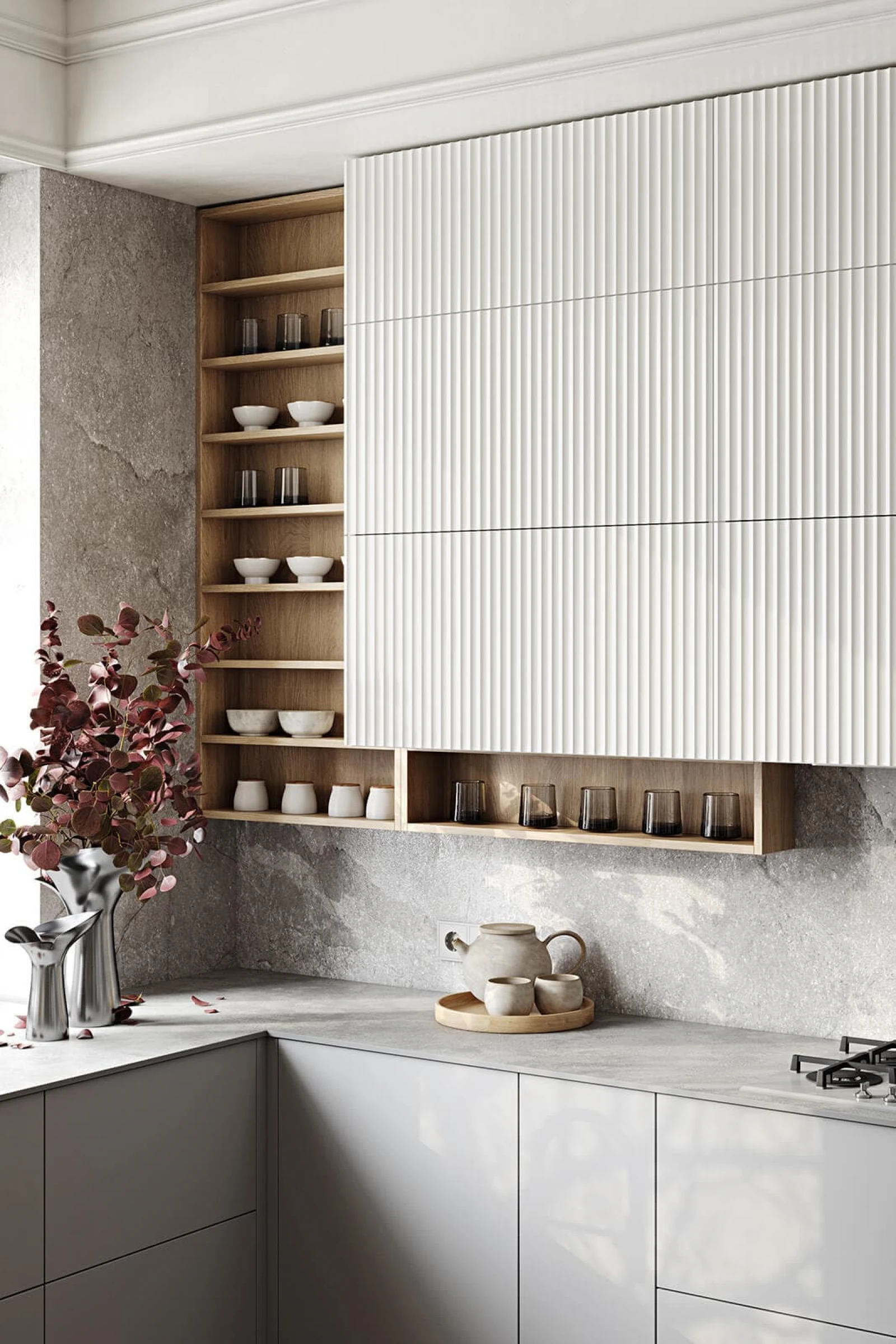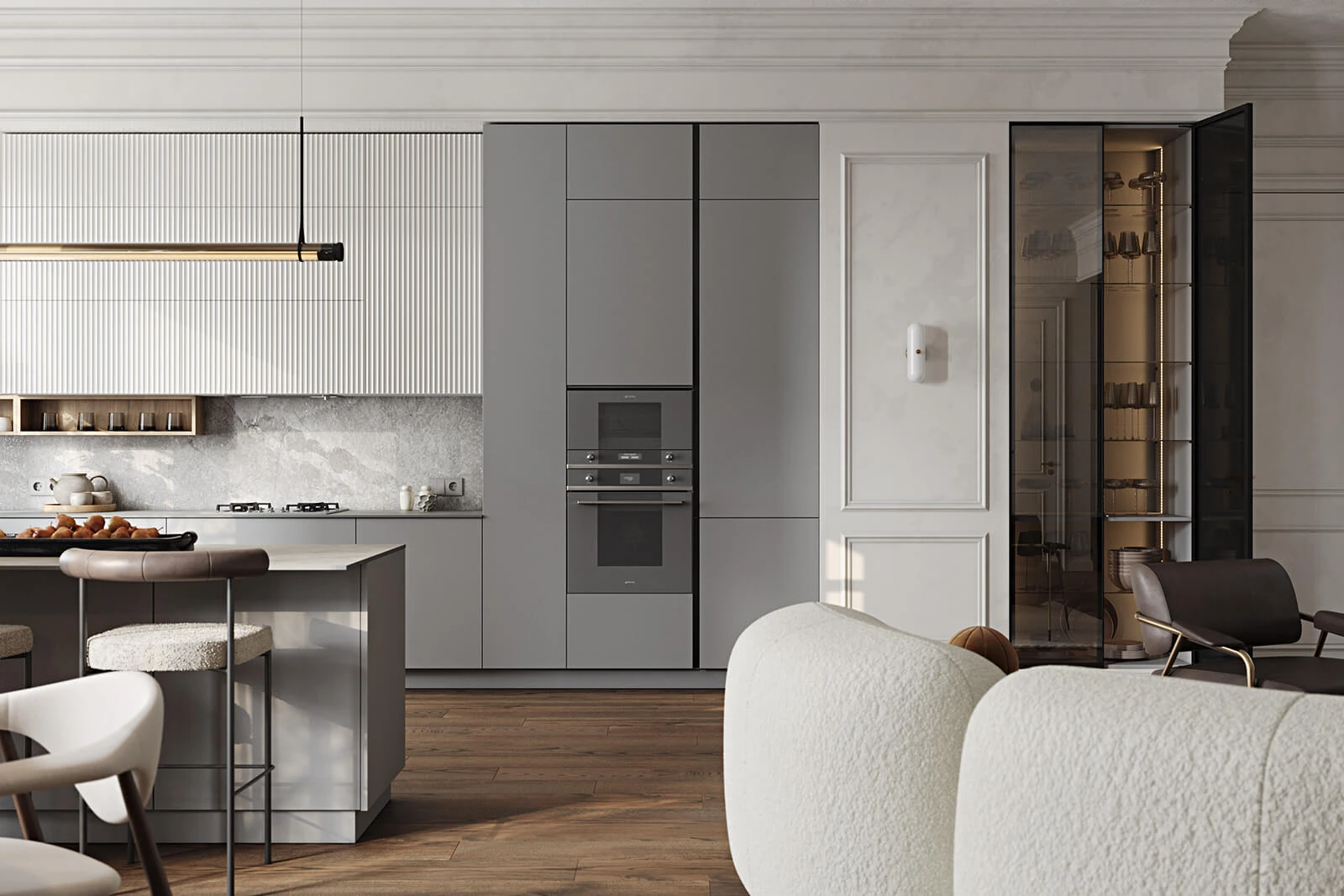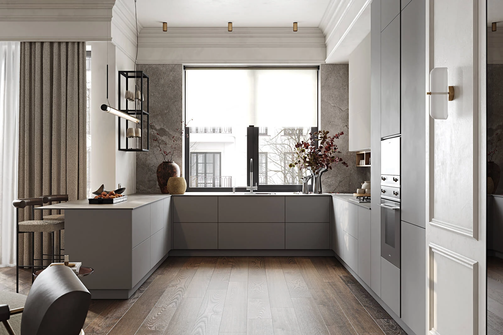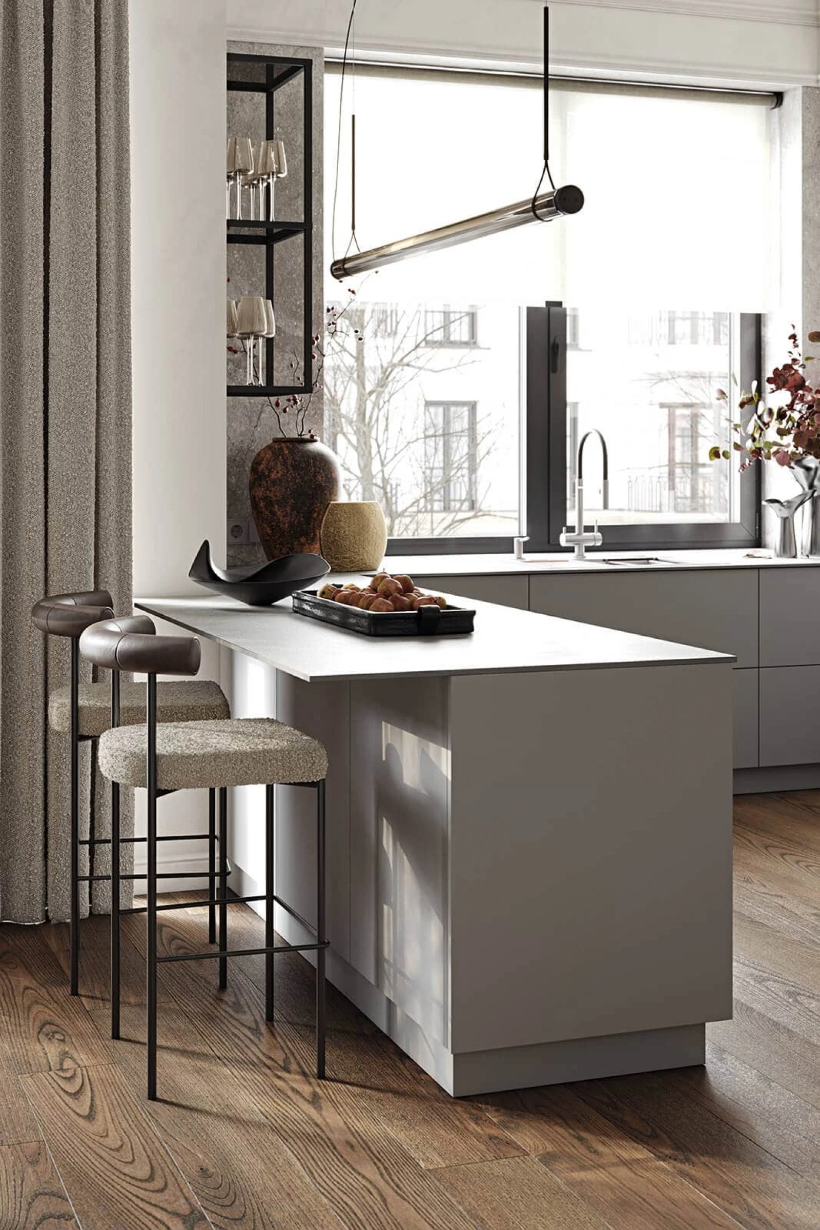 ФАСАДЫ Флавио (крашеная МДФ), цвет NCS S 0500-N Матовый / акрил FENIX NTM, цвет Серый NTM (0752) СТОЛЕШНИЦА Компакт-плита, 12 мм, декор Цинк Нирвана