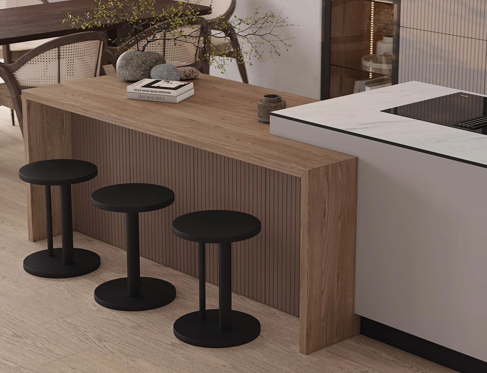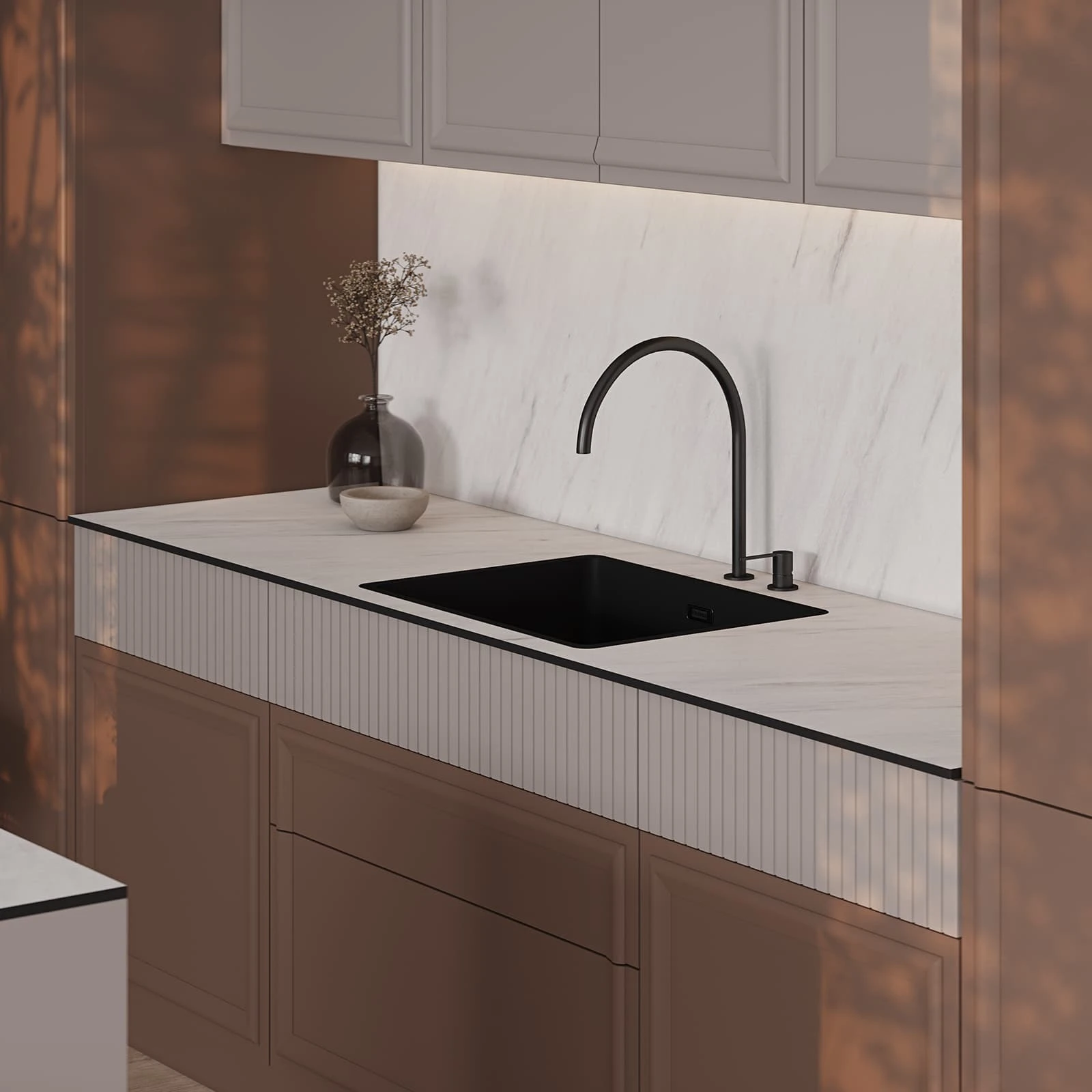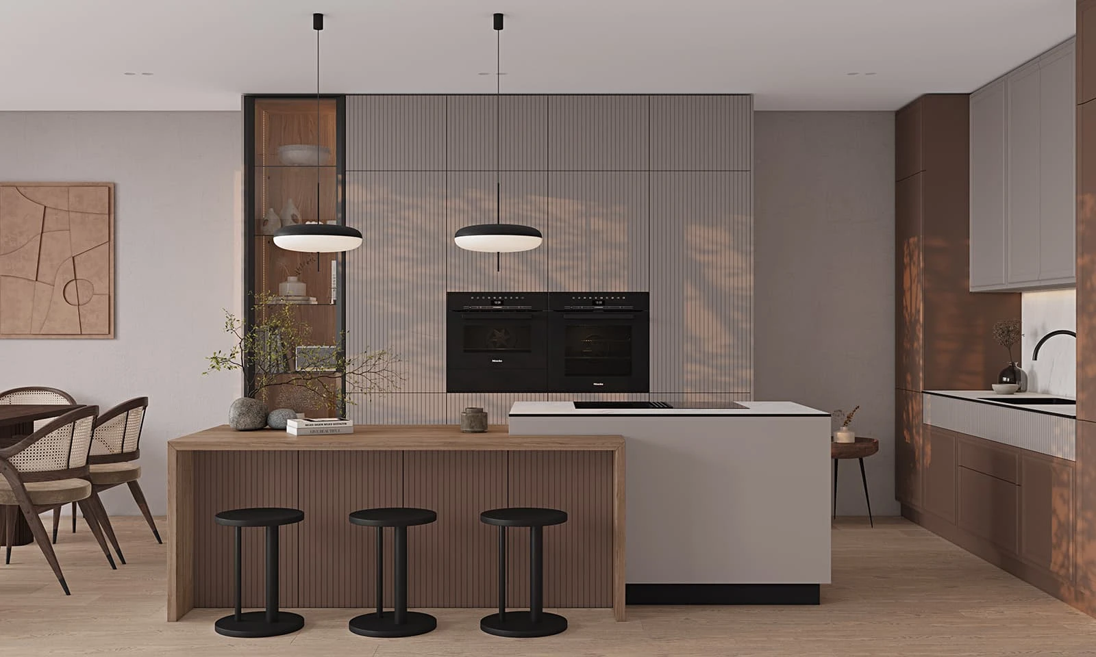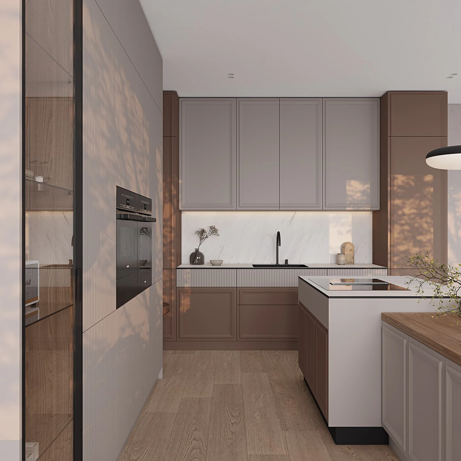 ФАСАДЫ Т682 Крашеная МДФ, цвет NCS S 2500-N Матовый / NCS S 6010-Y70R Матовый; Т651 Крашеная МДФ, цвет NCS S 2500-N Матовый / NCS S 6010-Y70R Матовый СТОЛЕШНИЦА Компакт-плита, 12 мм / КС массив дуба, 38 мм, цвет #181 (воскобейц Орех)