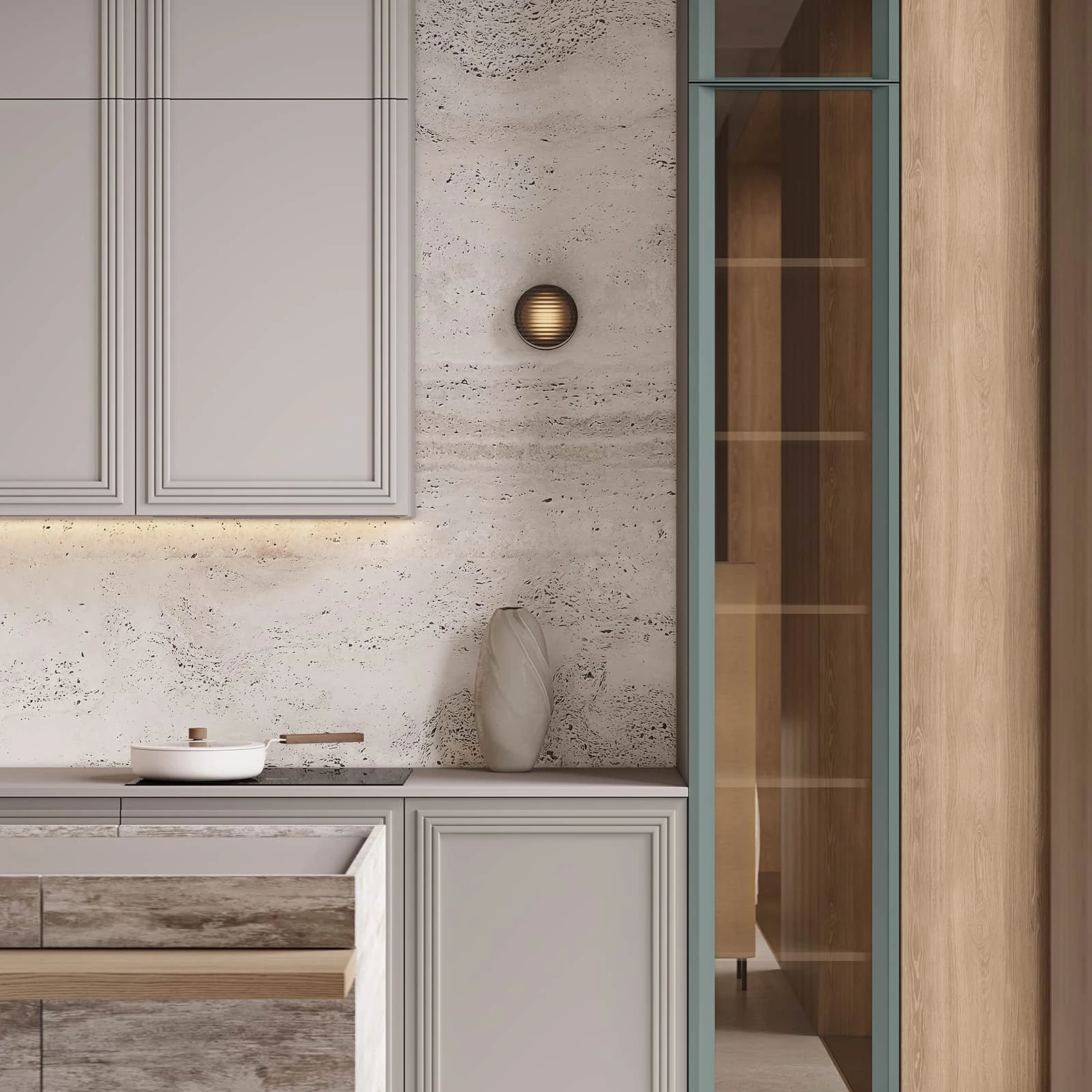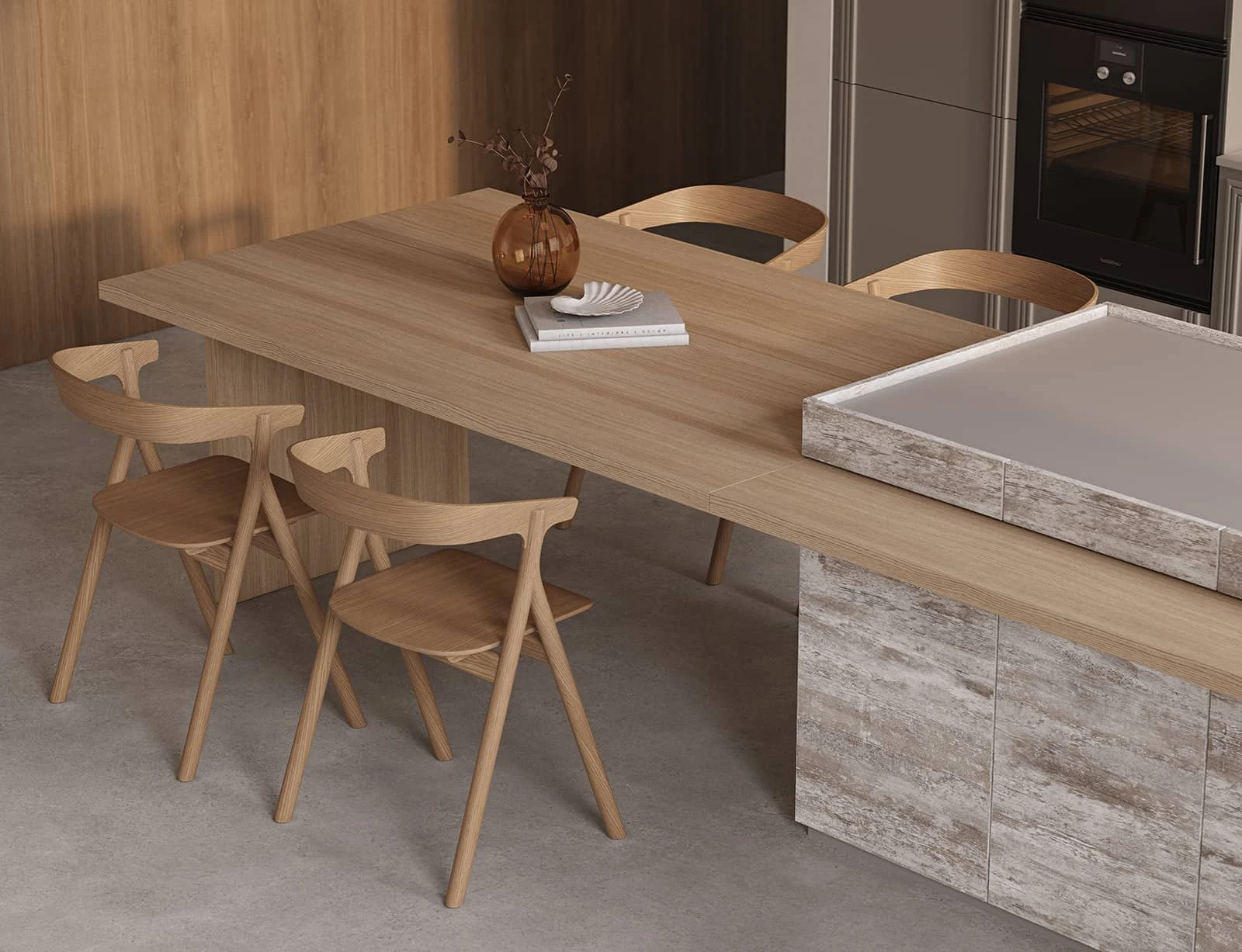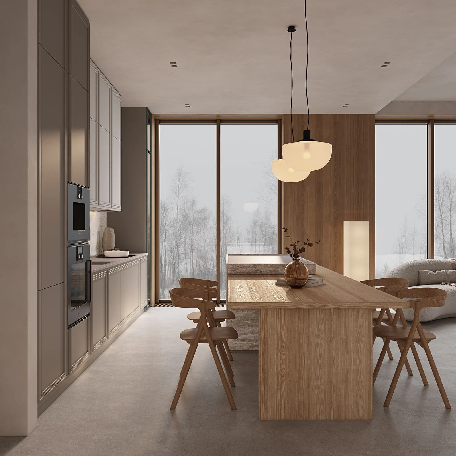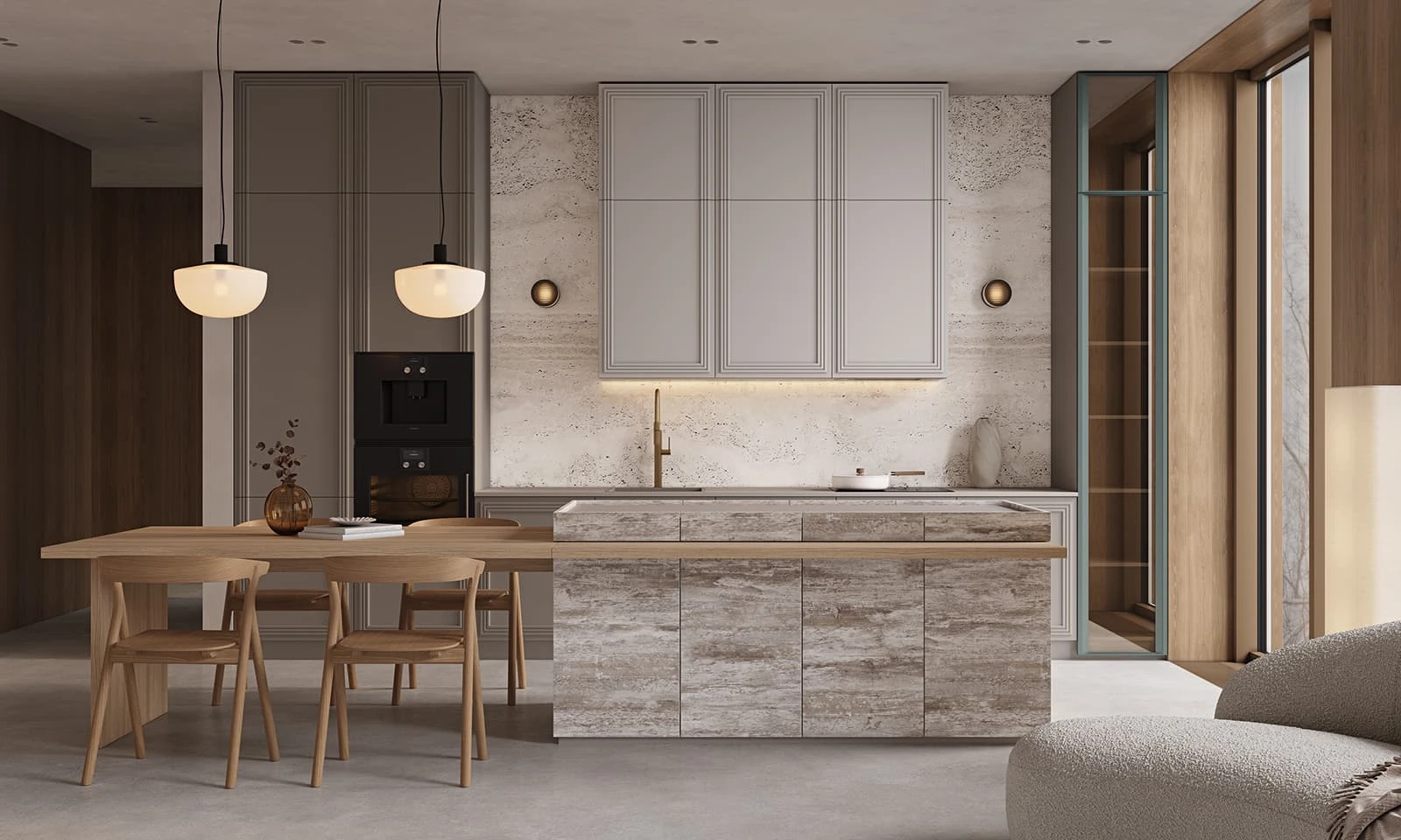 ФАСАДЫ Т650 Крашеная МДФ, цвет 124 / NCS S 1500-N СТОЛЕШНИЦА Акрил Fenix NTM, 20 мм, цвет Серо-бежевый NTM (0748) / КС массив дуба, 38 мм, цвет #183 (масловоск Бесцветный)
