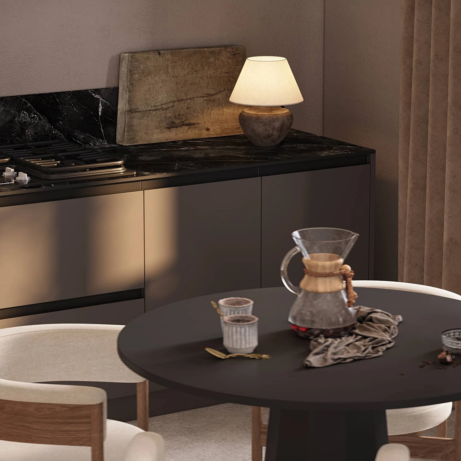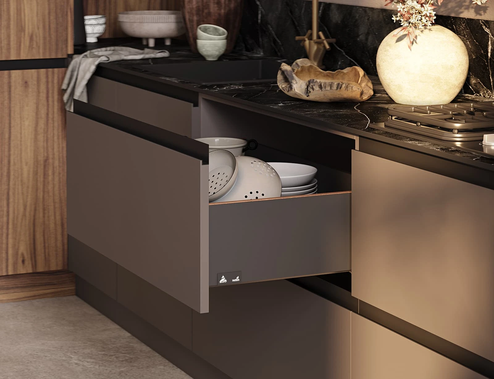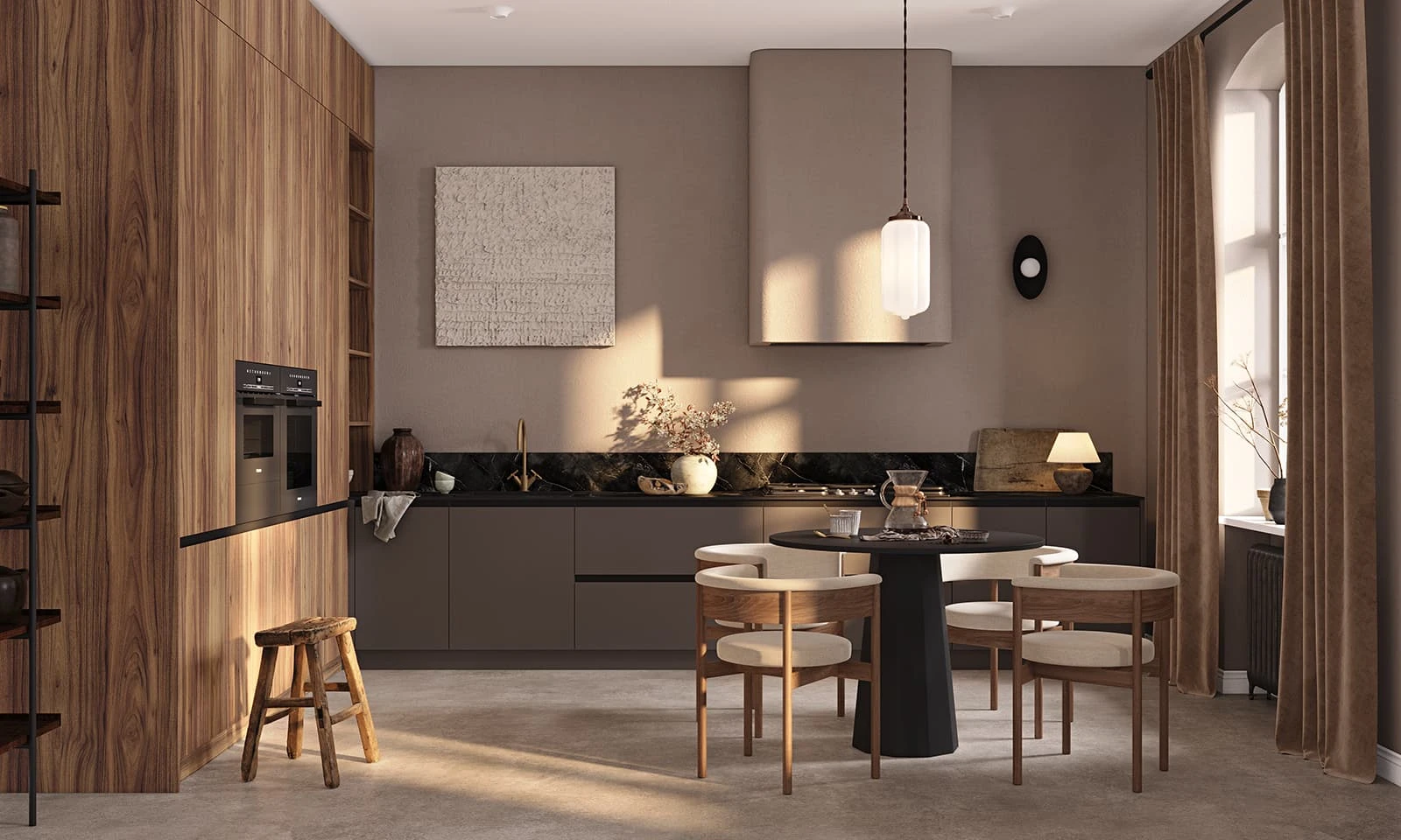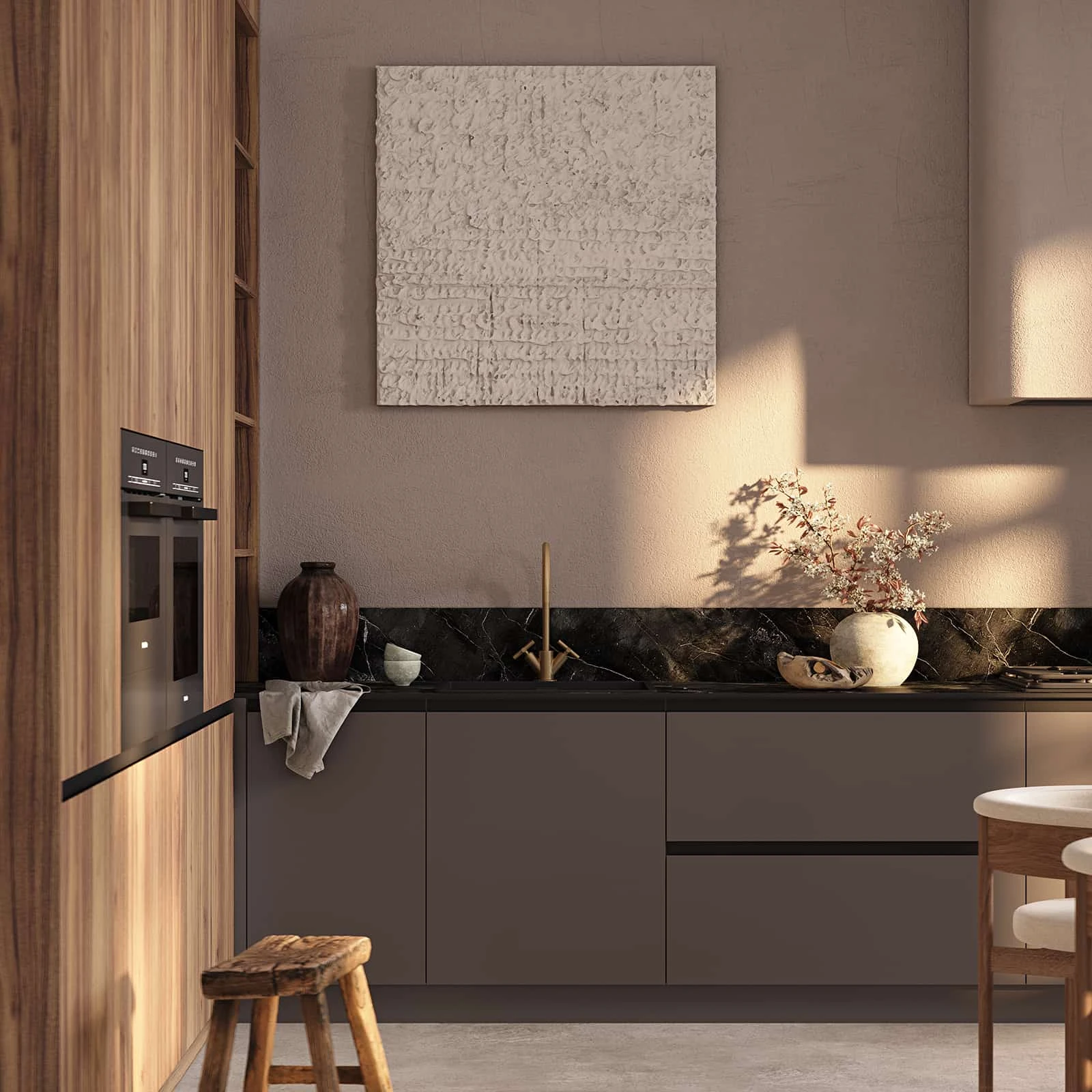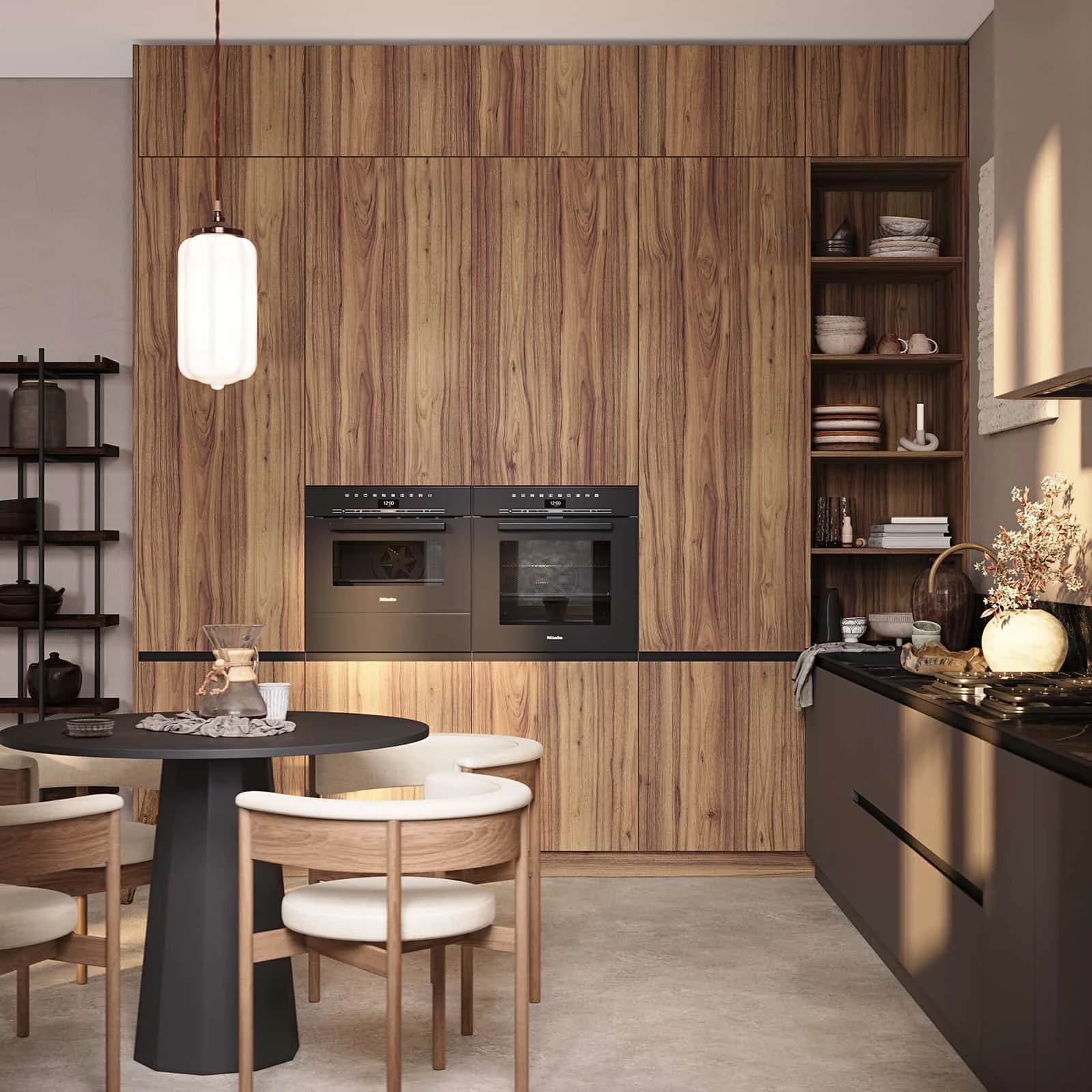 ФАСАДЫ Т119В / T121В Шпон дерева (Орех Американский); крашеная МДФ, цвет NCS S 7502-R Матовый СТОЛЕШНИЦА Компакт-плита, 12 мм, декор Куритиба