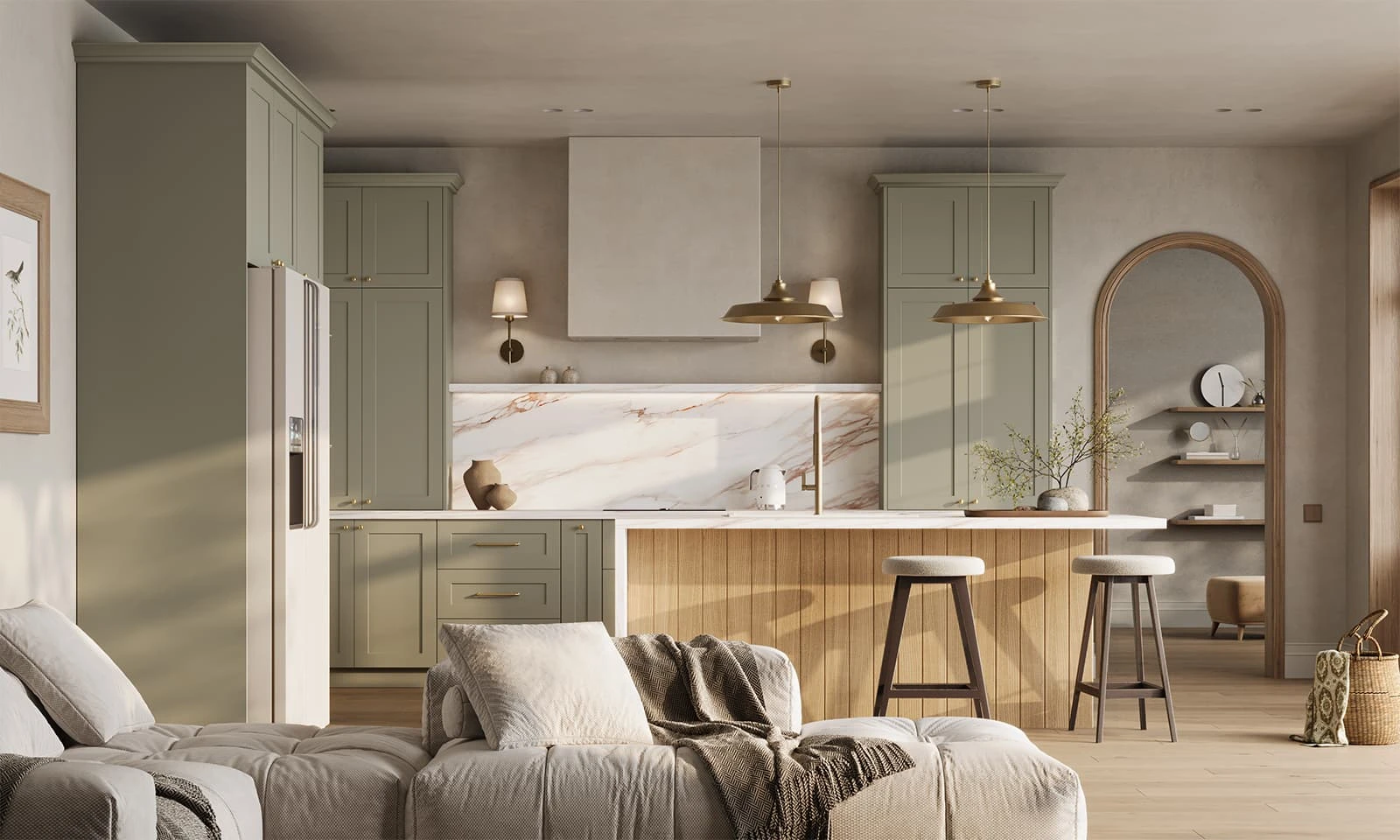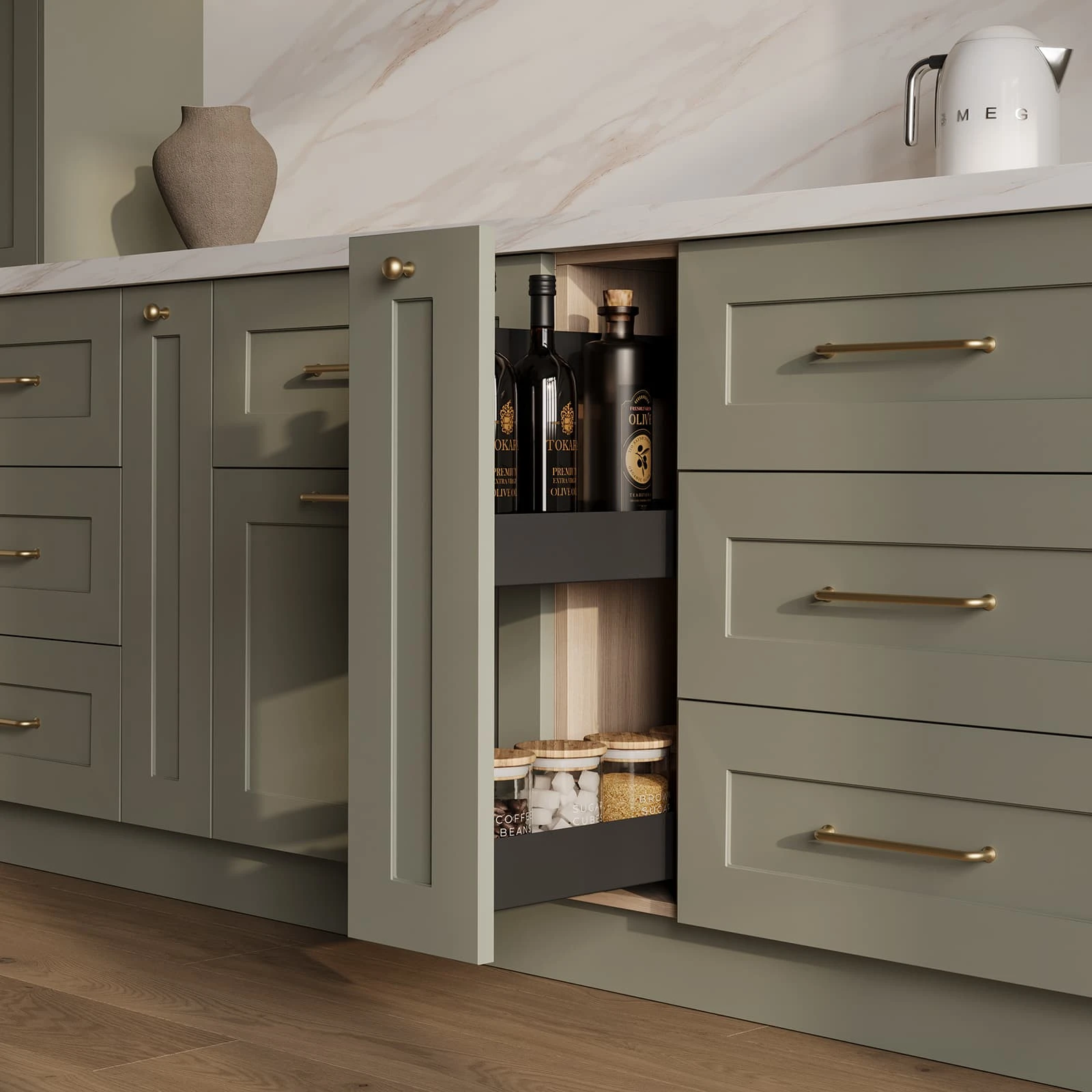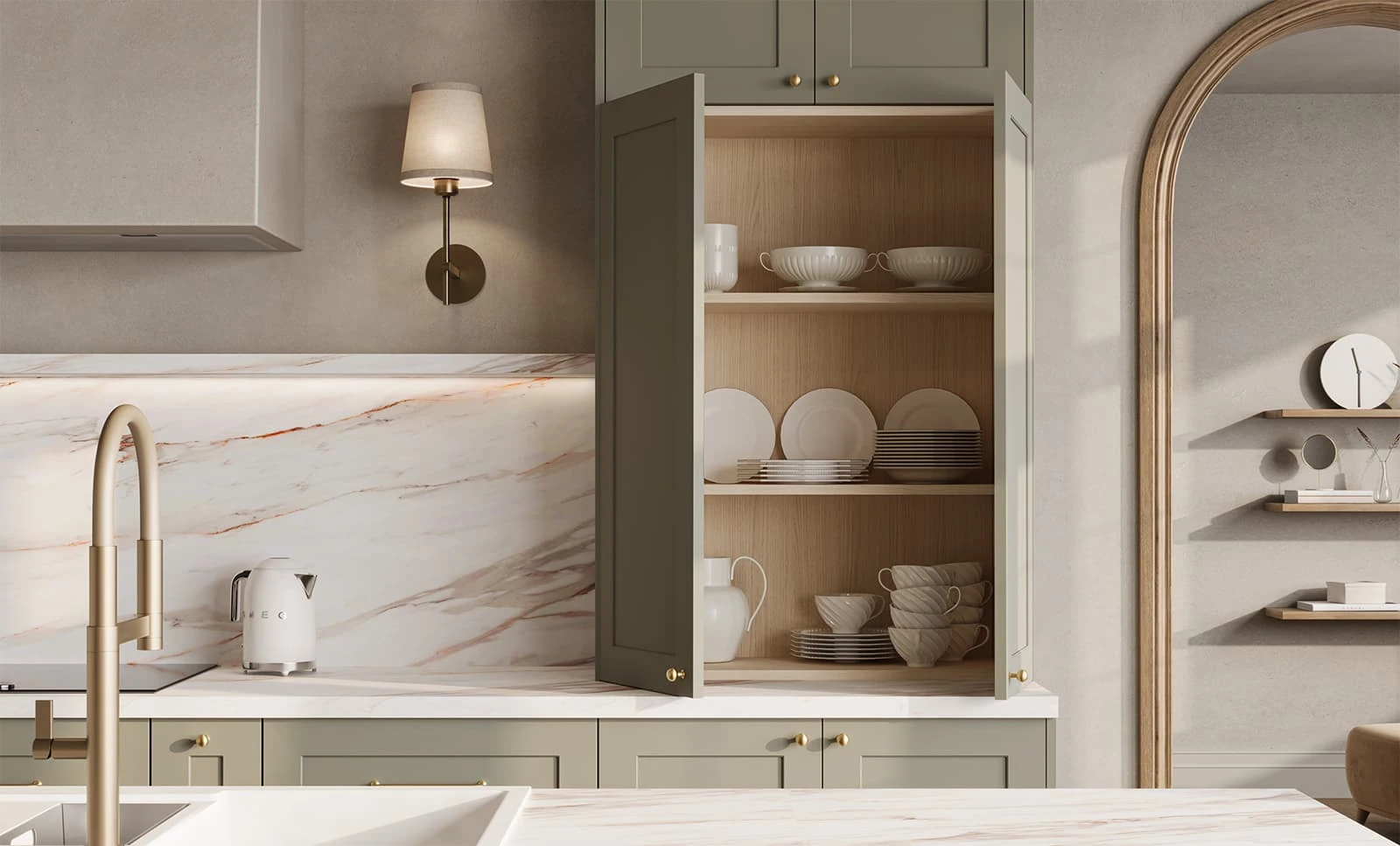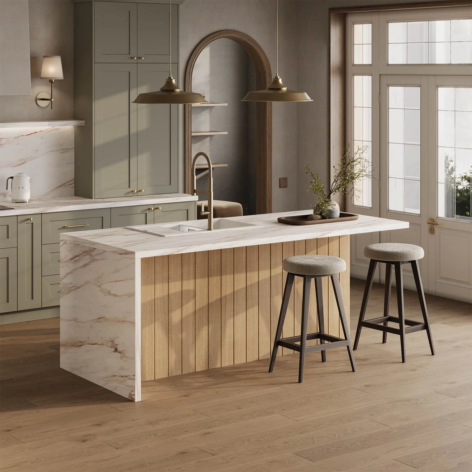 ФАСАДЫ Ливон (МДФ/ПВХ), цвет NCS S 3010-G20Y Матовый СТОЛЕШНИЦА Пластик HPL, 38 мм, декор Энцо