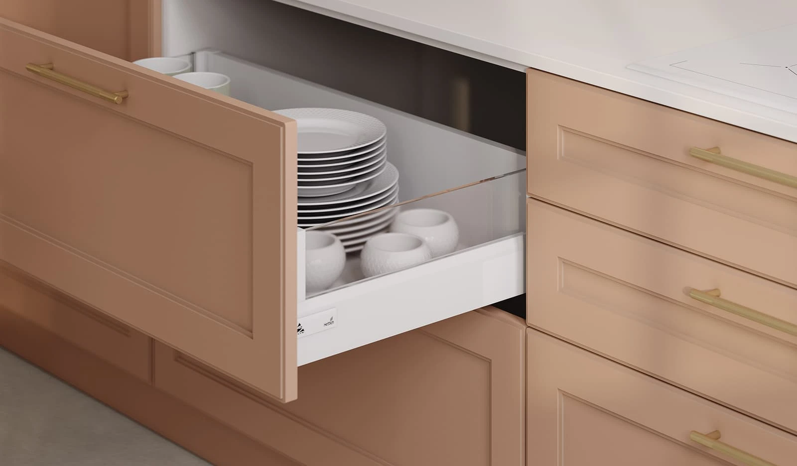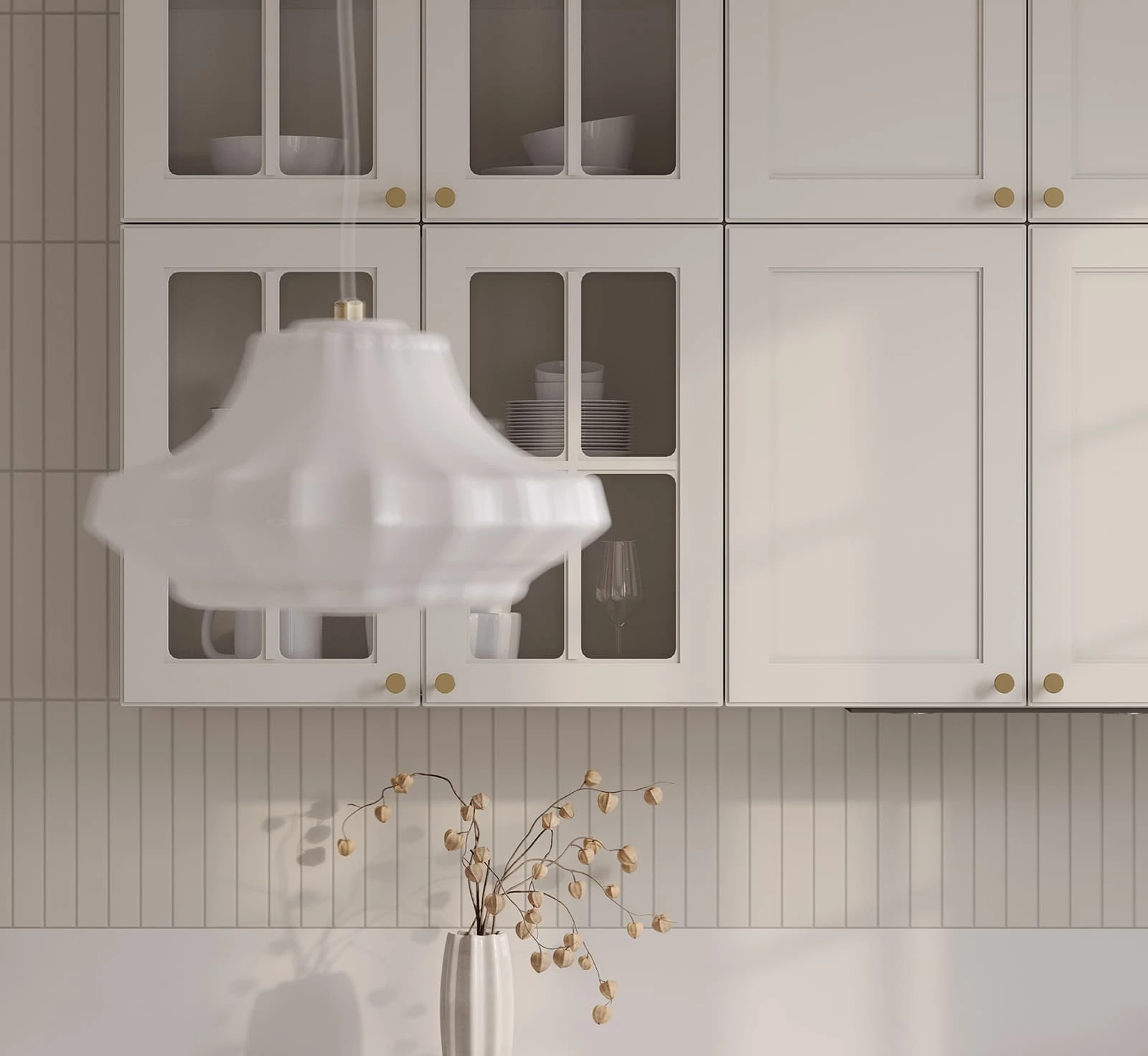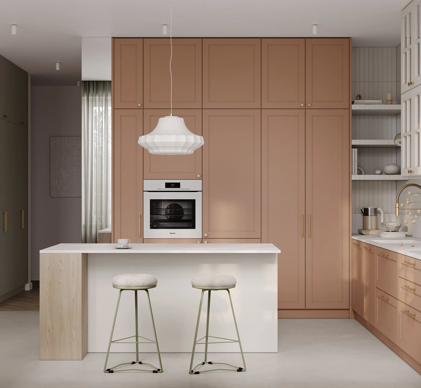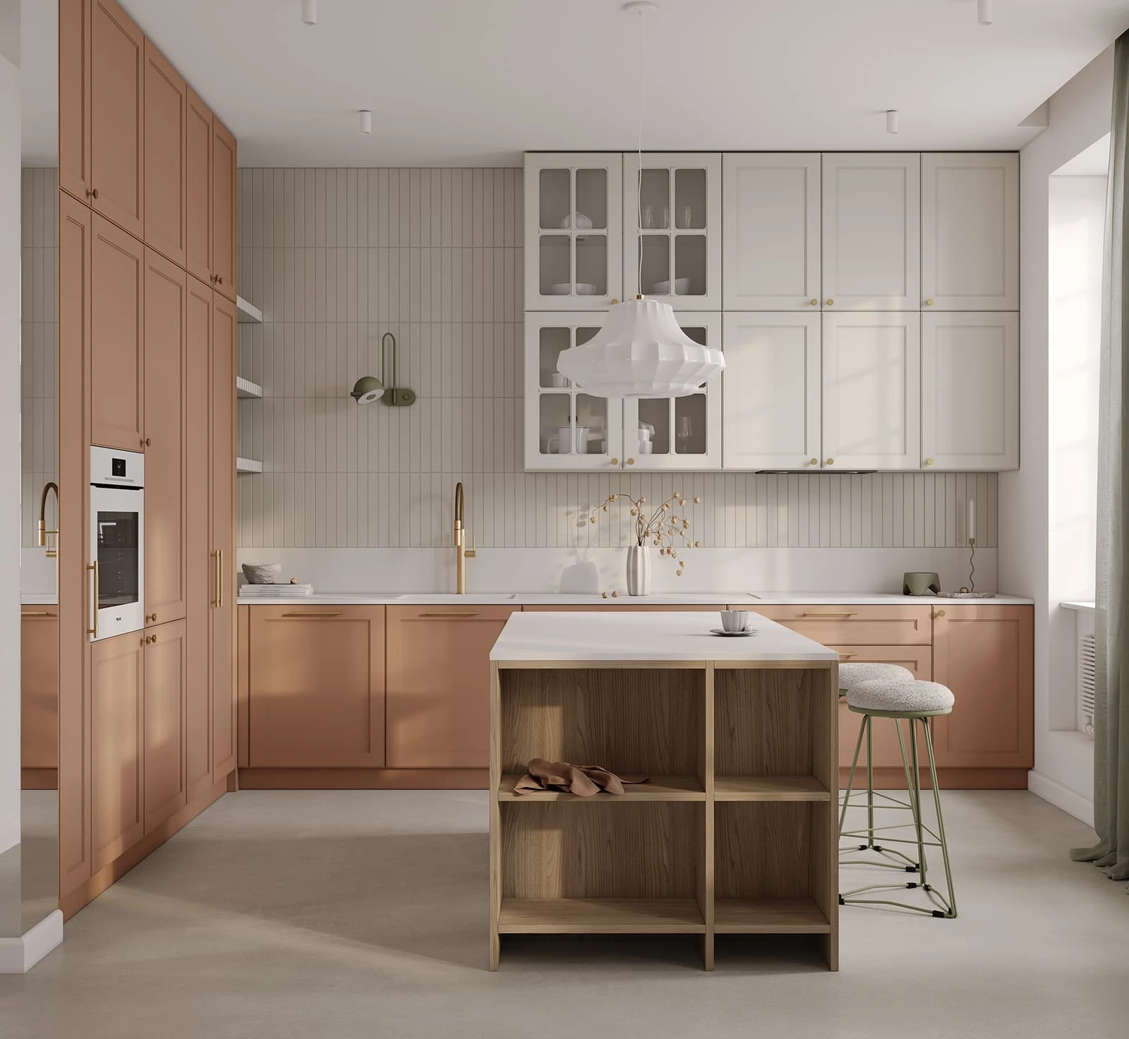 ФАСАДЫ Омега (крашеная МДФ), цвет NCS S 3020-Y50R Матовый / NCS S 1002-Y Матовый СТОЛЕШНИЦА Акрил Fenix NTM, 20 мм, цвет Белый NTM (0032)