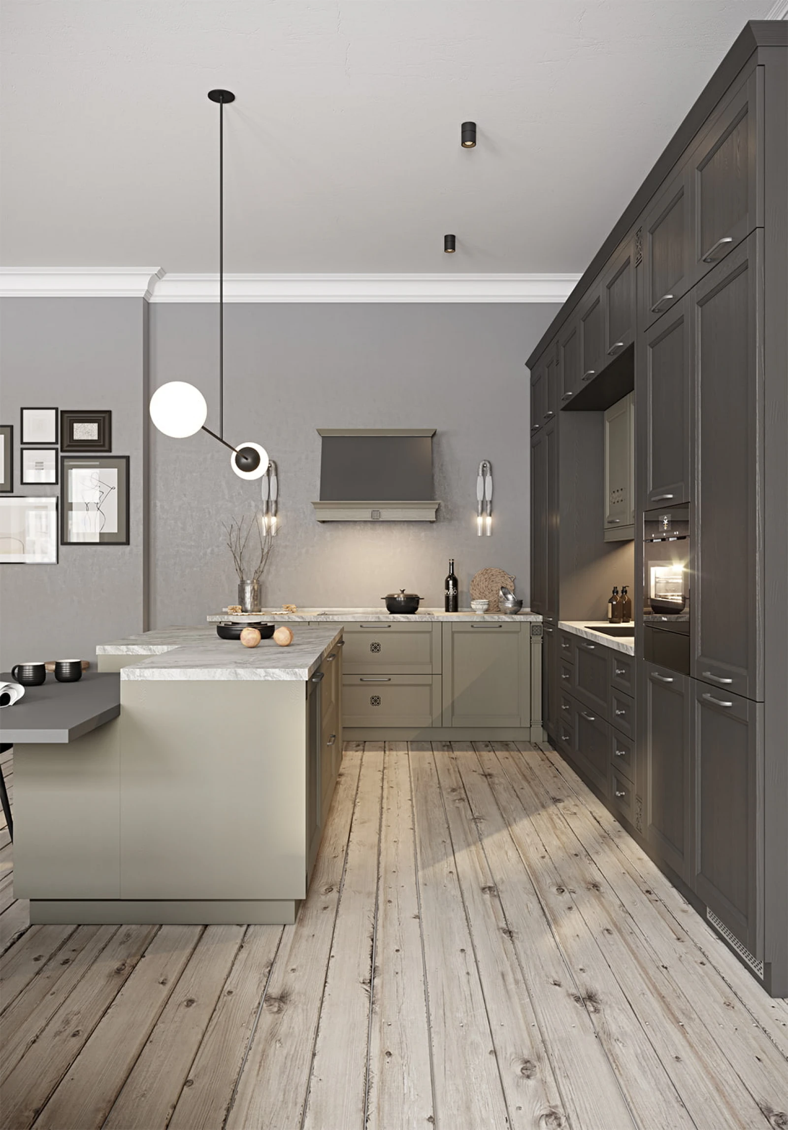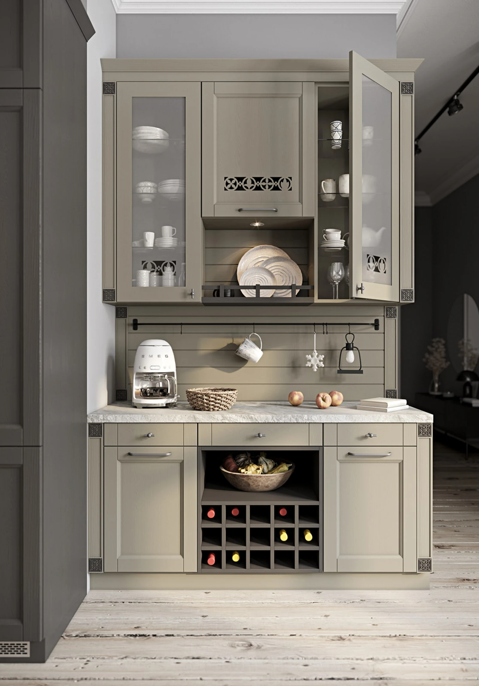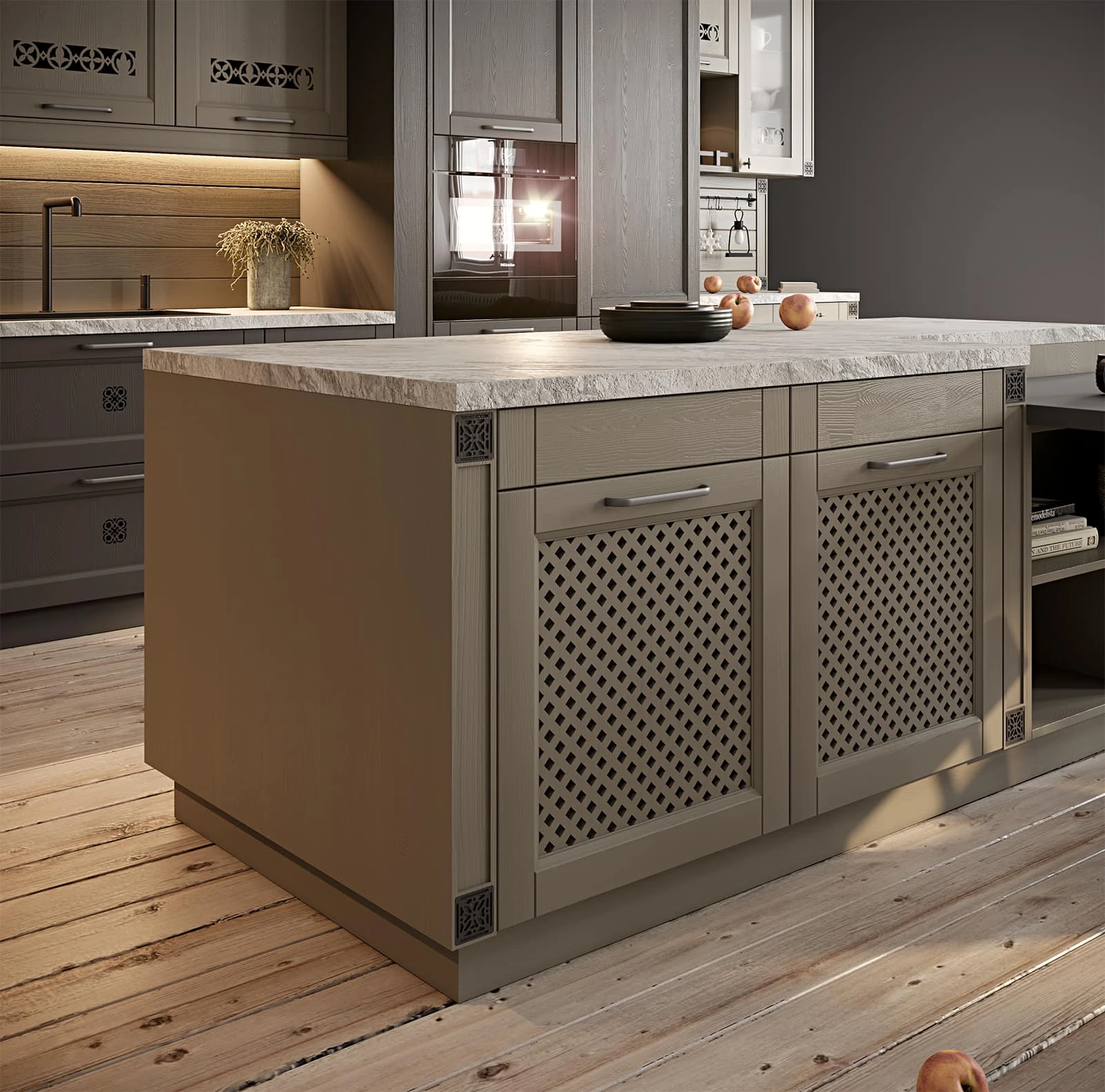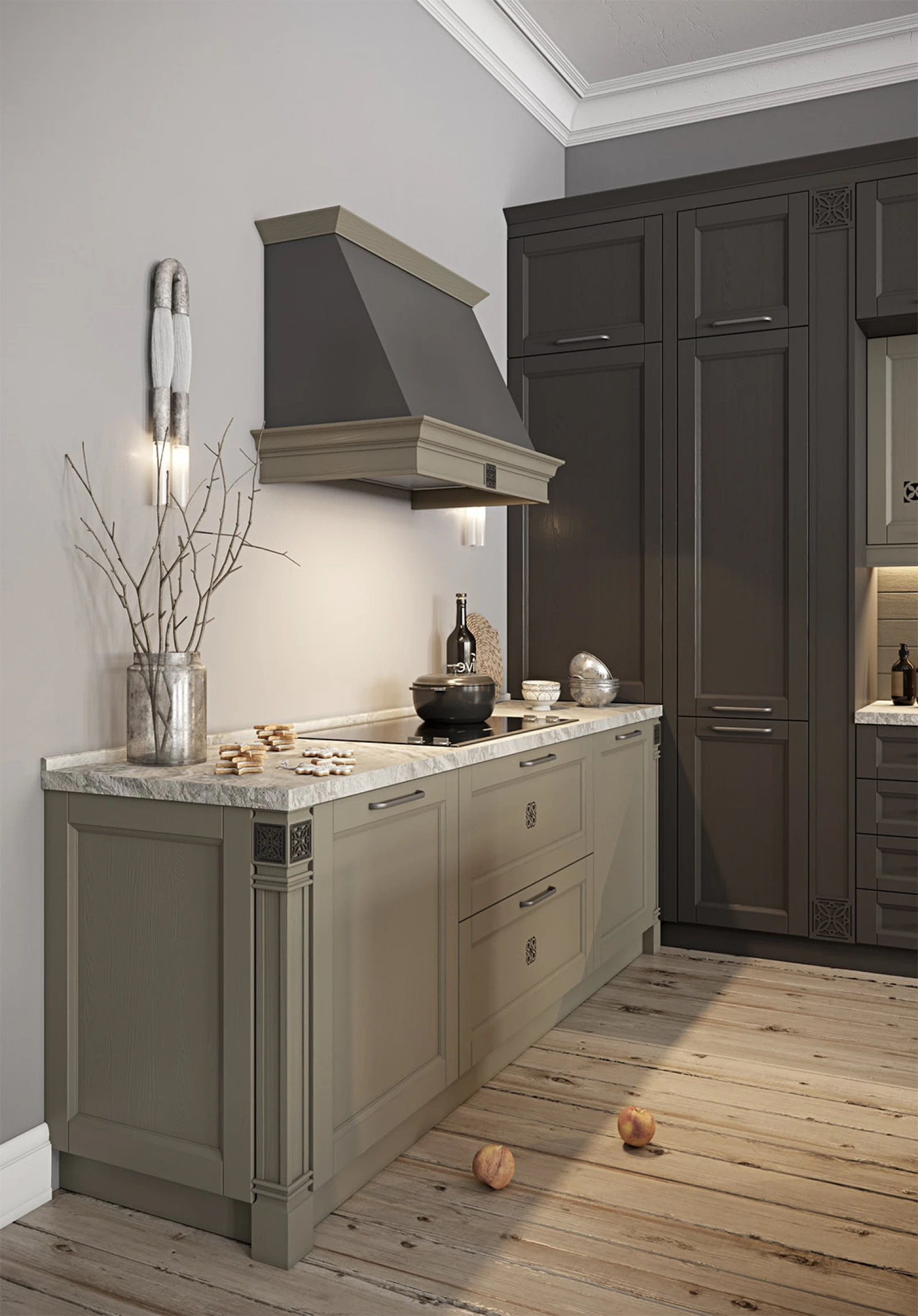 Опора декоративная ОД-10 (820), цвет вставки NCS S 7502-Y ; панель декоративная БПД-10-1; пилястра #13, цвет вставки NCS S 7502-Y ; балюстрада прямая «Техно»; плинтус мебельный ПМ-5; багет ЛГБ-1 прямой; вагонка, цвет NCS S 6005-G80Y; декоративный короб HB «Пьемонт» (900) под встраиваемую вытяжку, цвет купола / вставки NCS S 7502-Y
