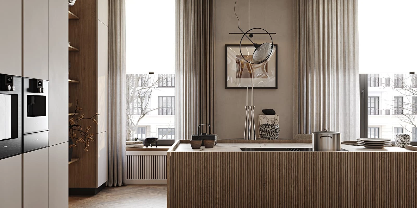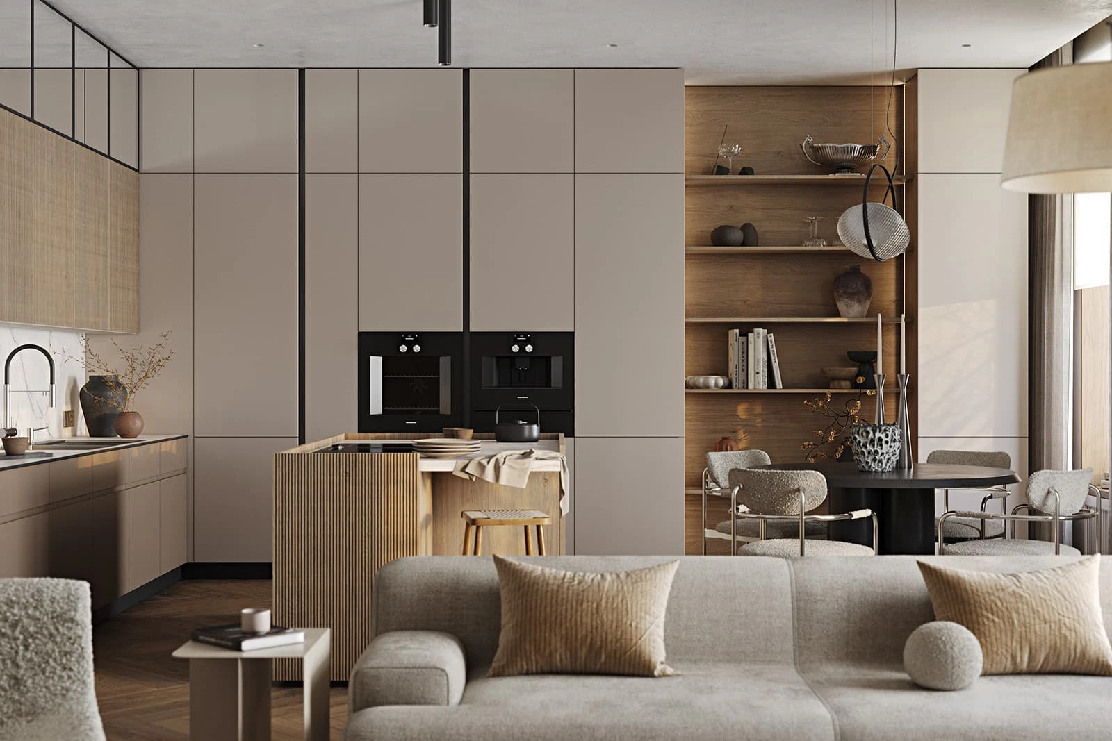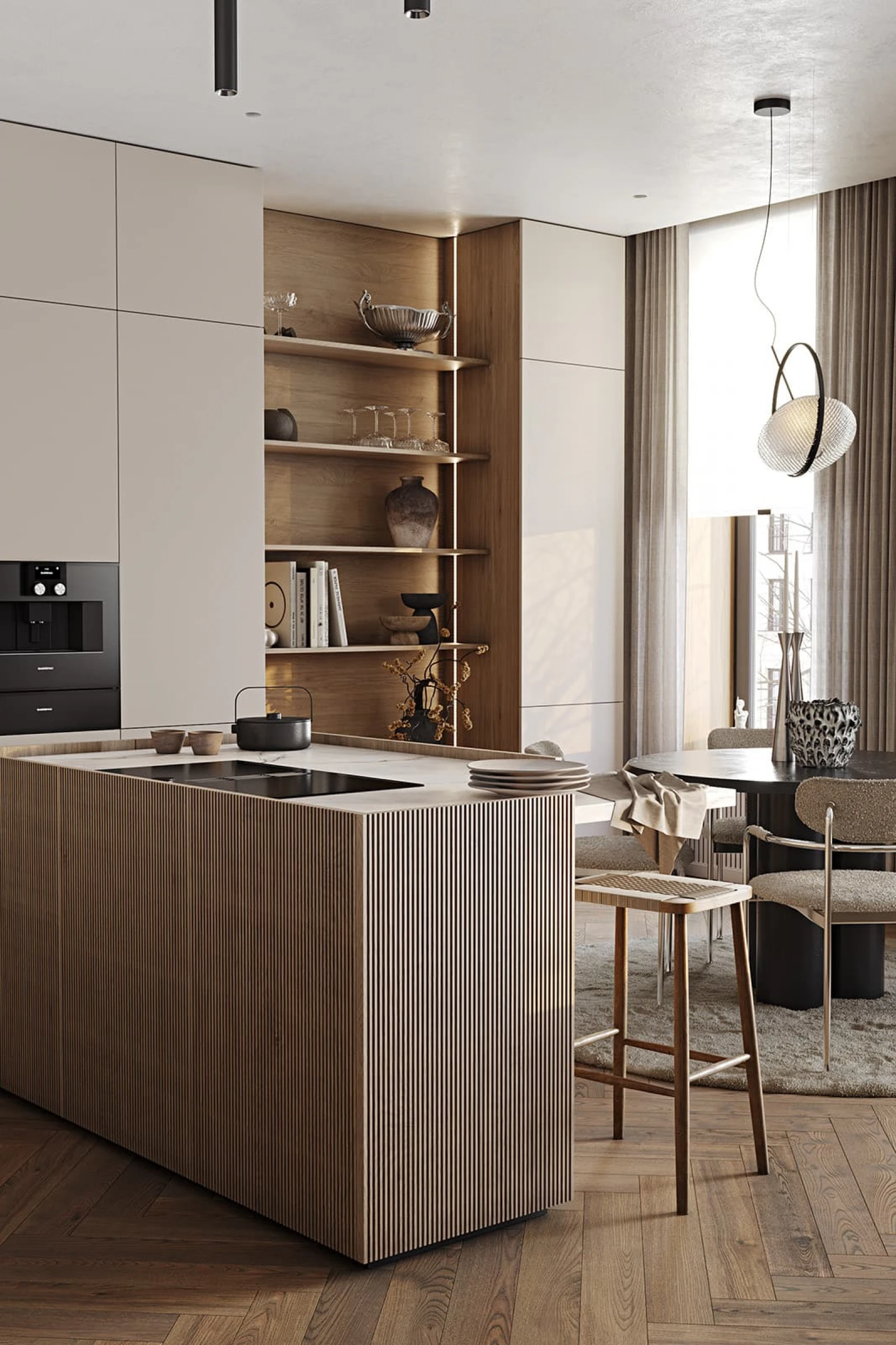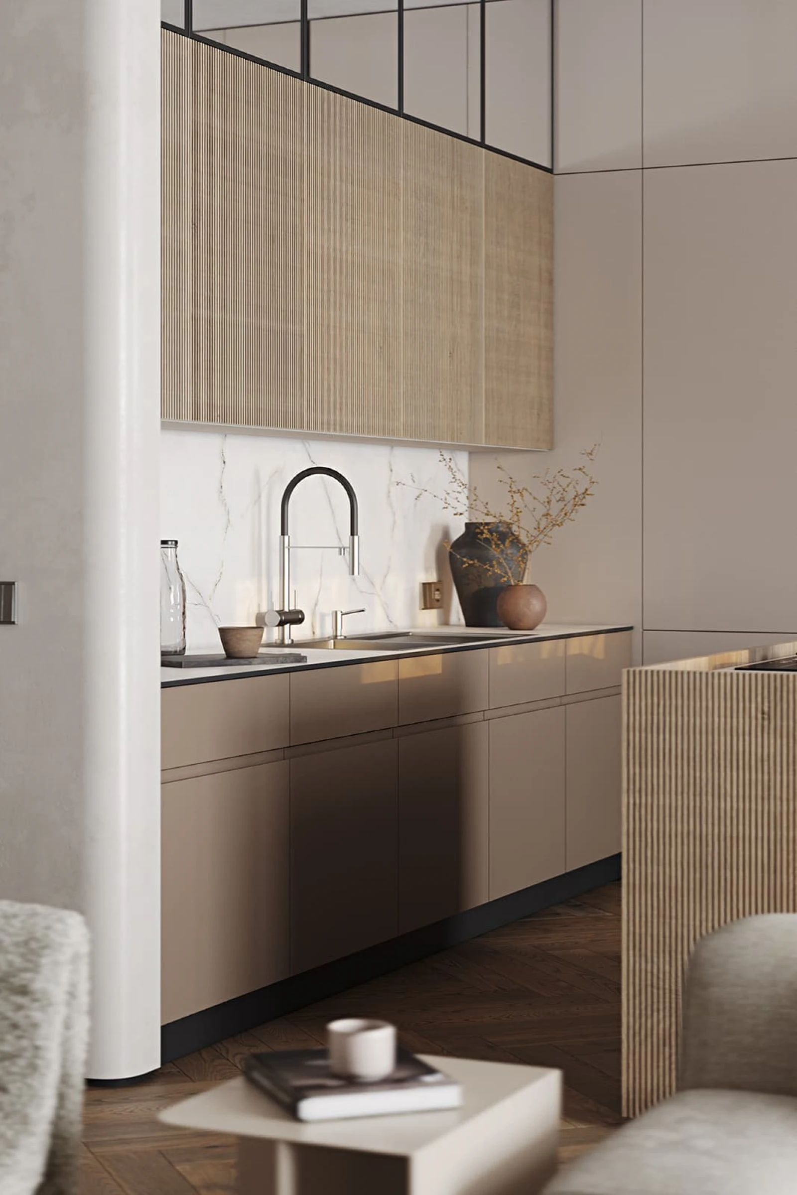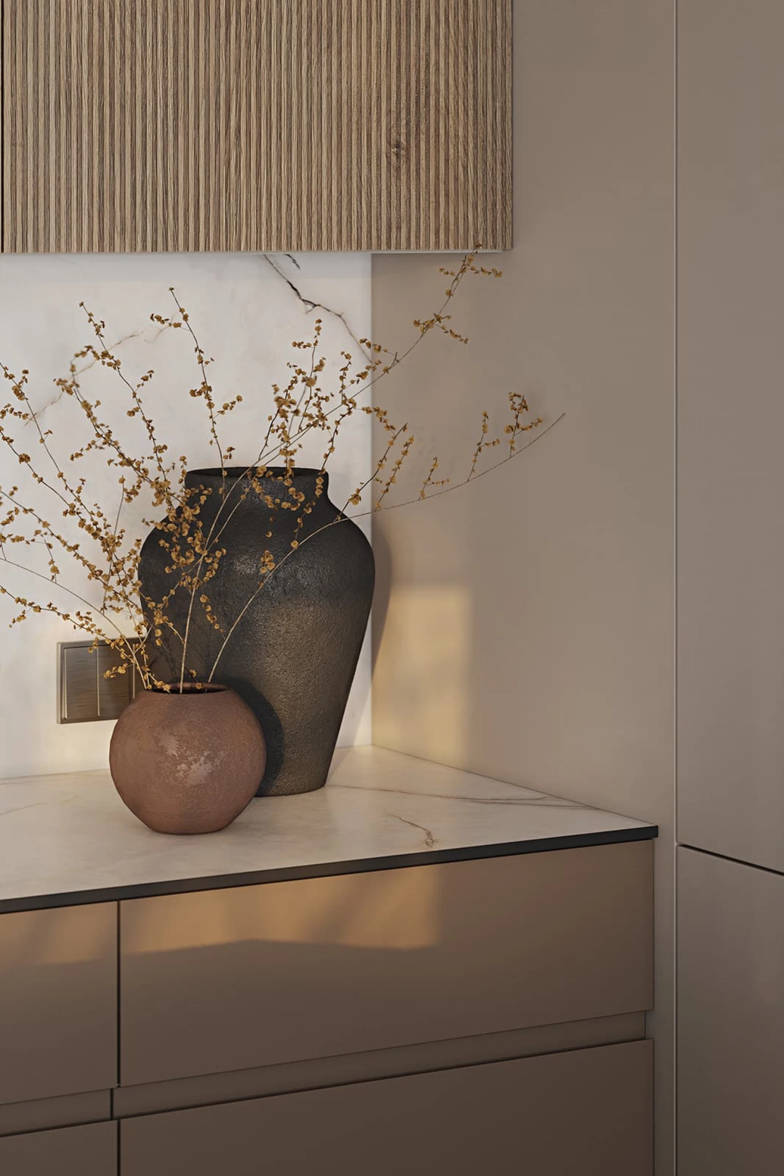 ФАСАДЫ Т440 Шпон дуба, цвет #189 (воскобейц Белый) / акрил FENIX NTM, цвет Серо-бежевый NTM (0748) / крашеная МДФ, цвет NCS S 5010-Y50R Матовый СТОЛЕШНИЦА Компакт-плита, 12 мм, декор Миони / пластик HPL, 38 мм, декор Миони
