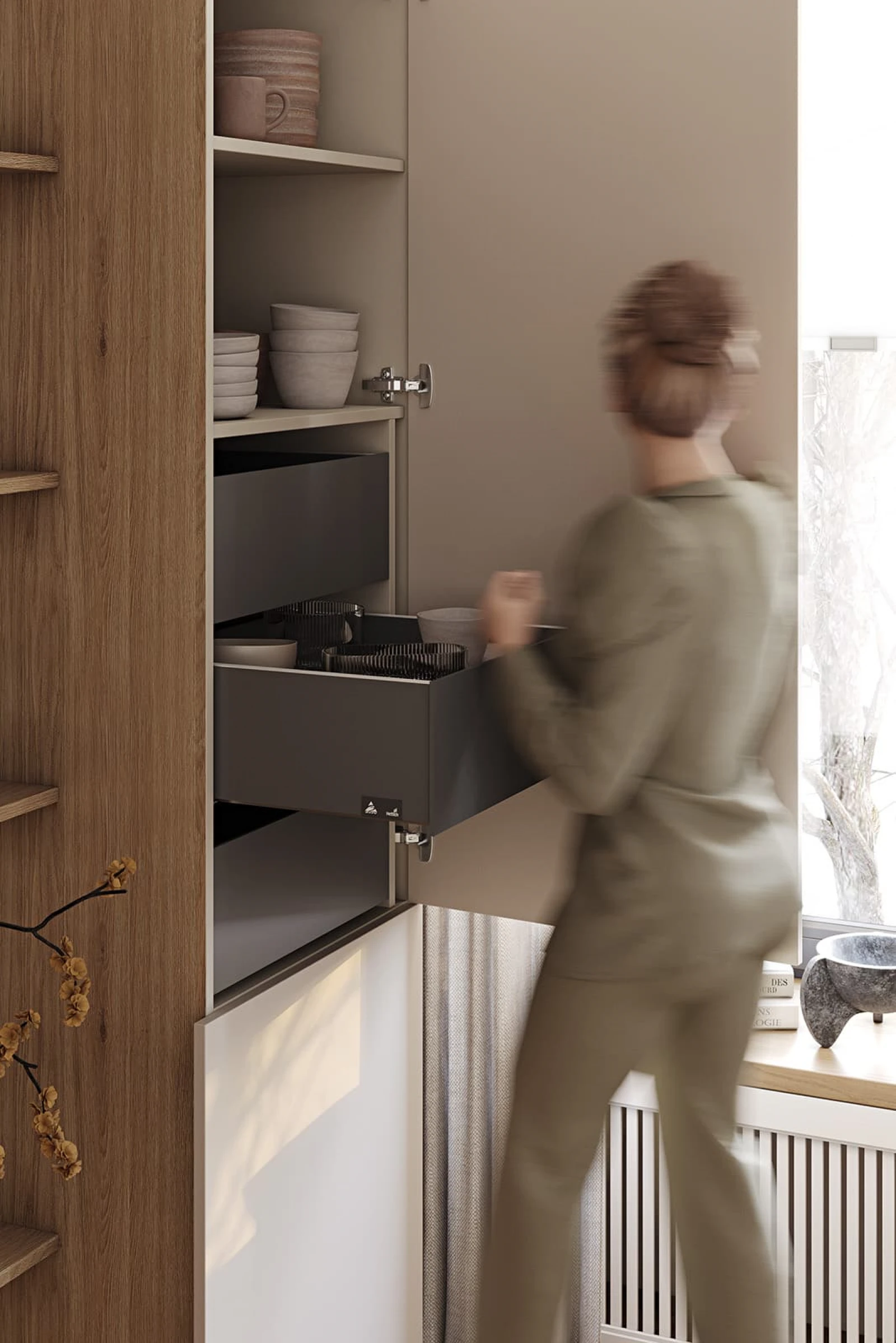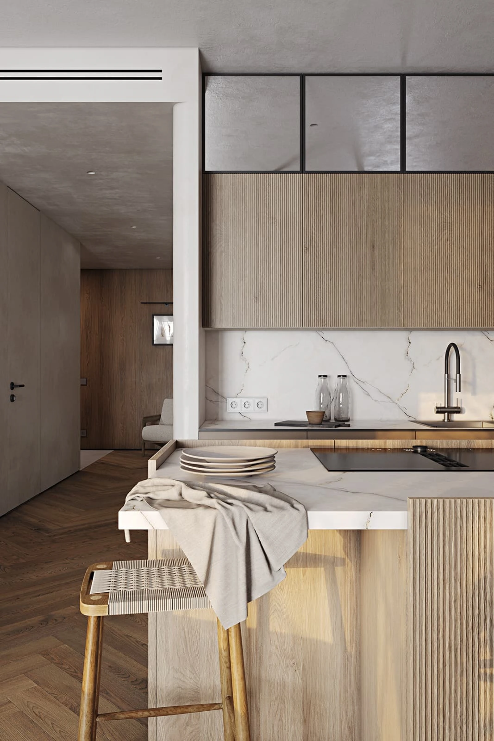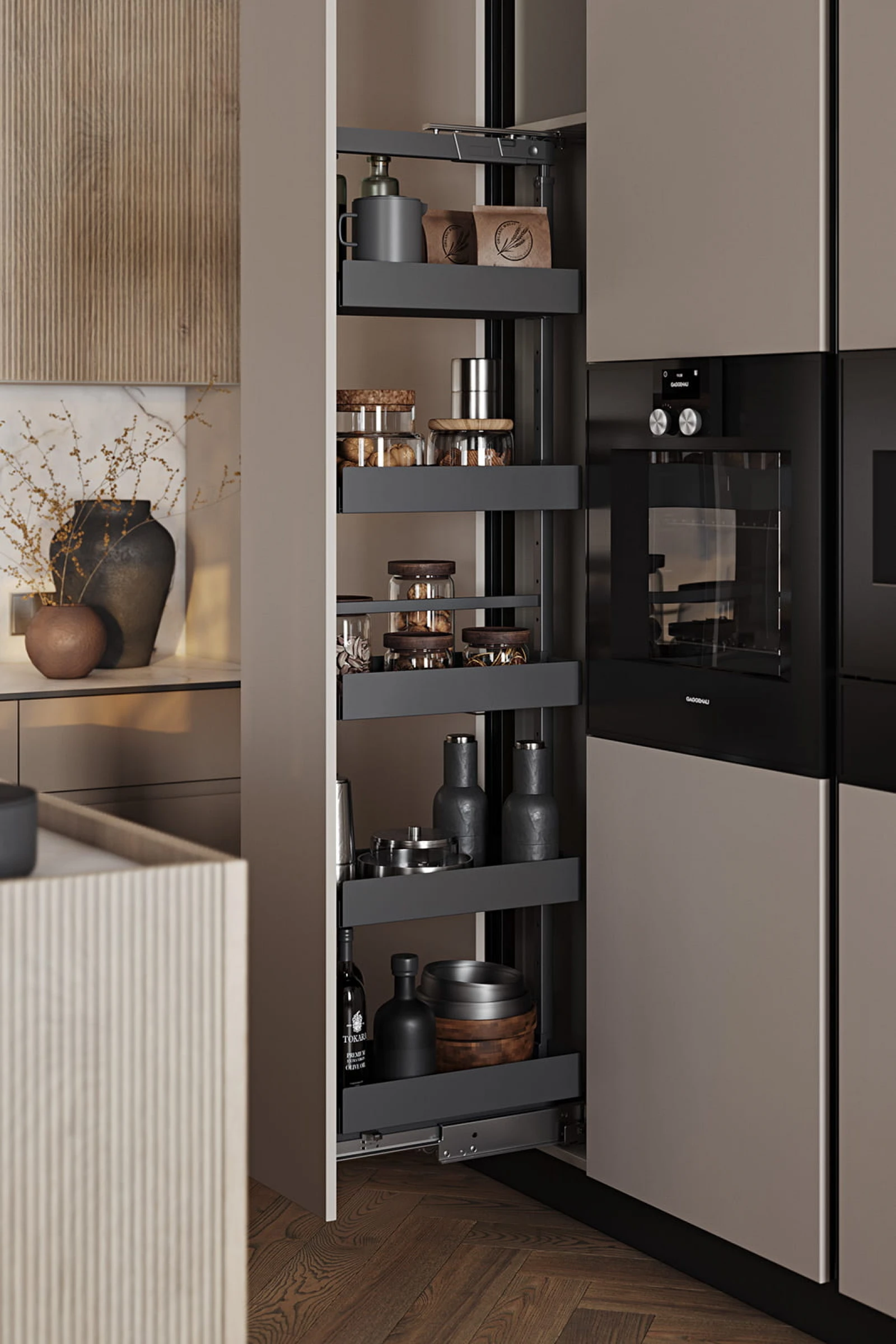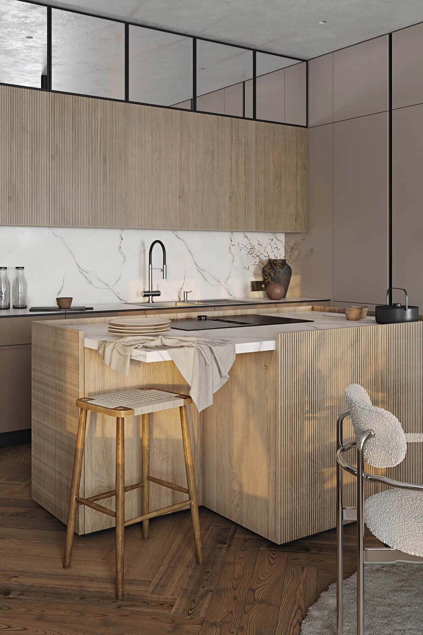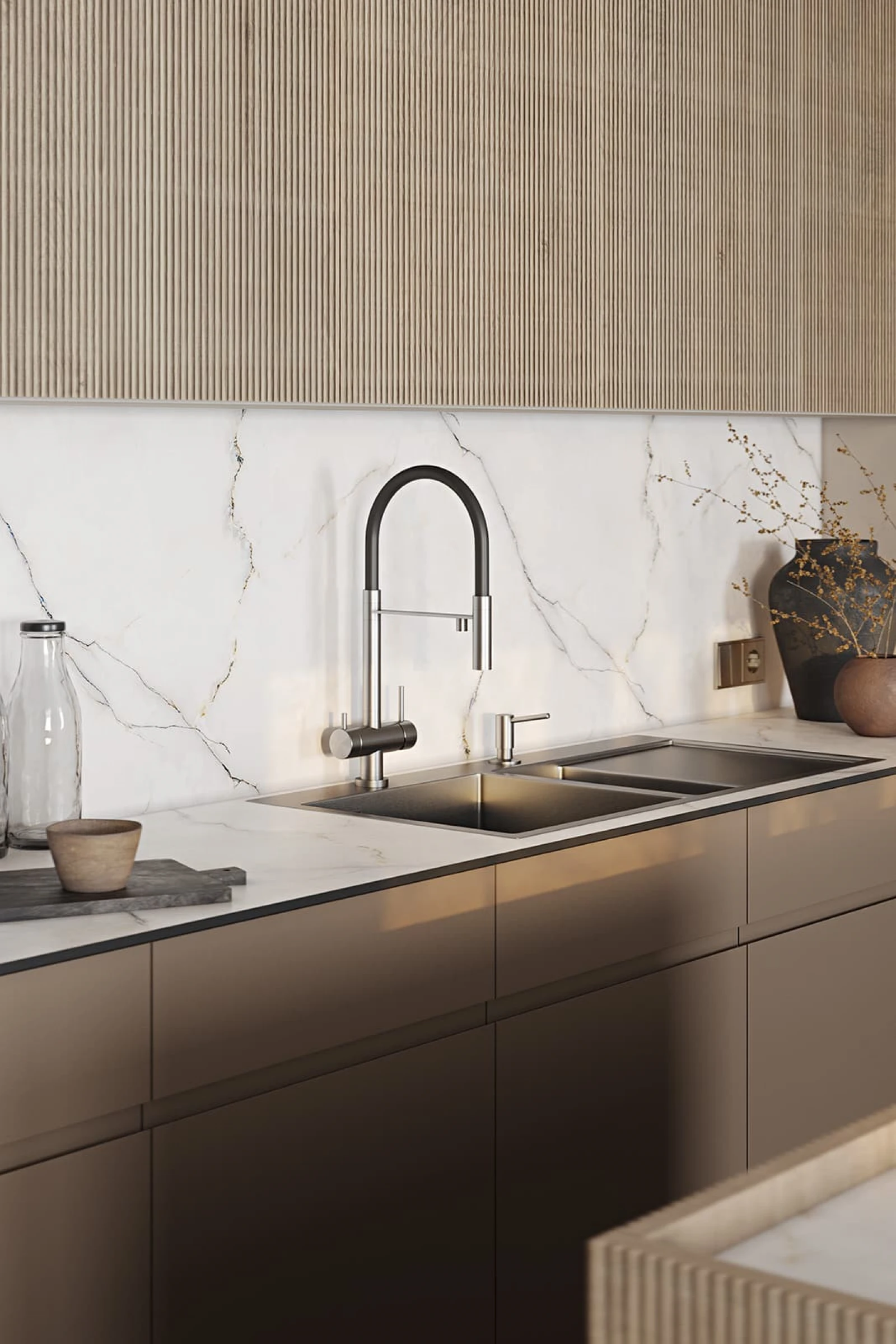 ФАСАДЫ Т440 Шпон дуба, цвет #189 (воскобейц Белый) / акрил FENIX NTM, цвет Серо-бежевый NTM (0748) / крашеная МДФ, цвет NCS S 5010-Y50R Матовый СТОЛЕШНИЦА Компакт-плита, 12 мм, декор Миони / пластик HPL, 38 мм, декор Миони