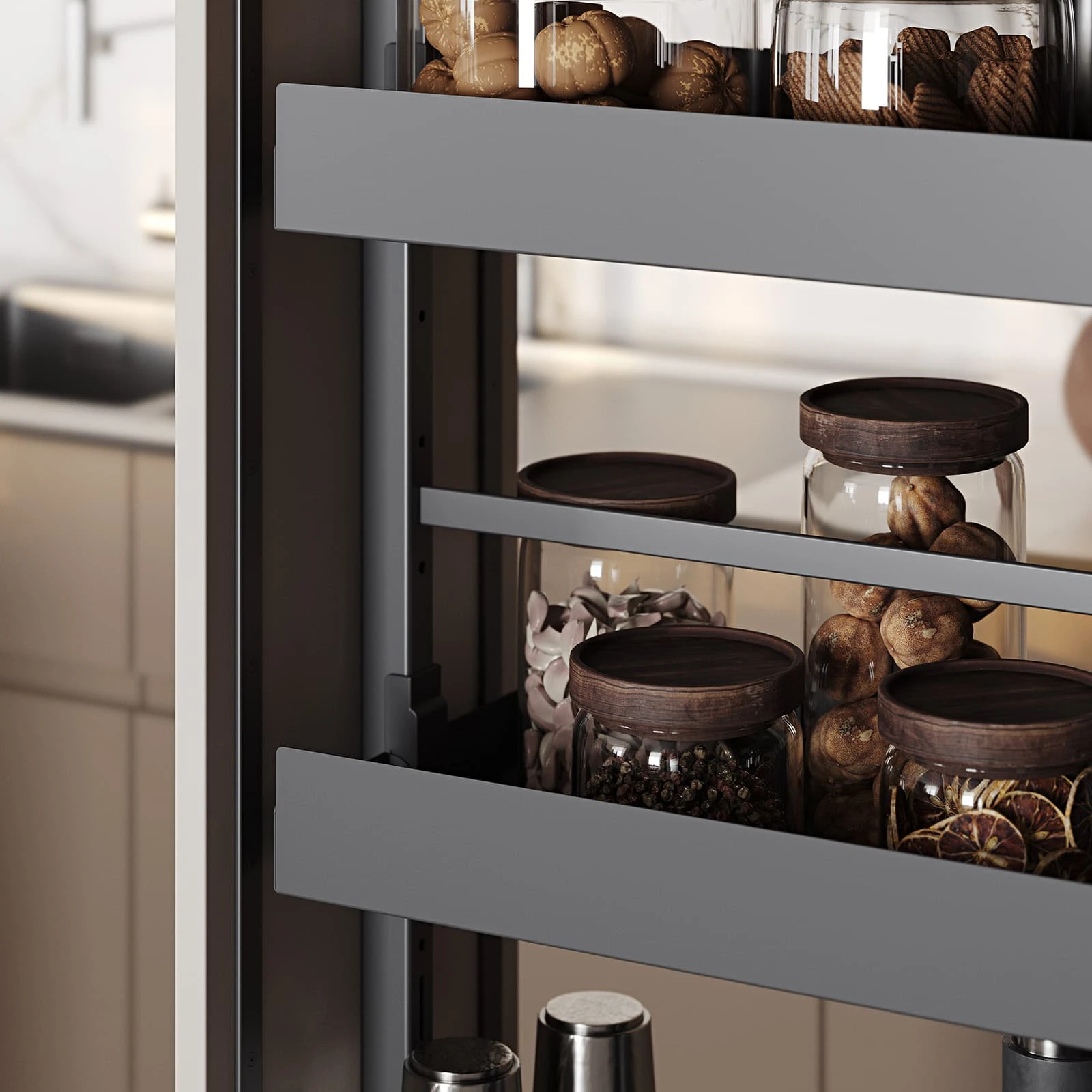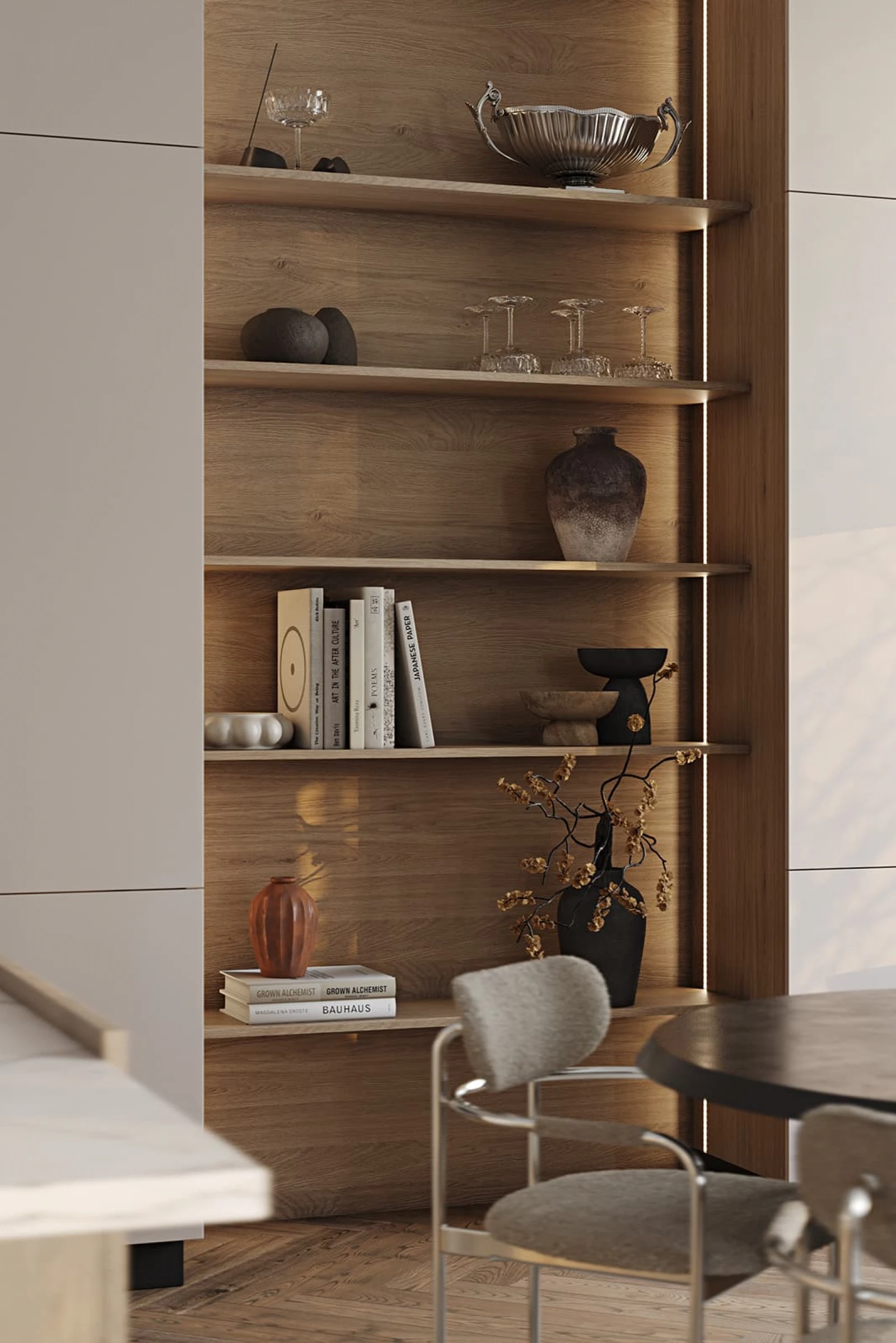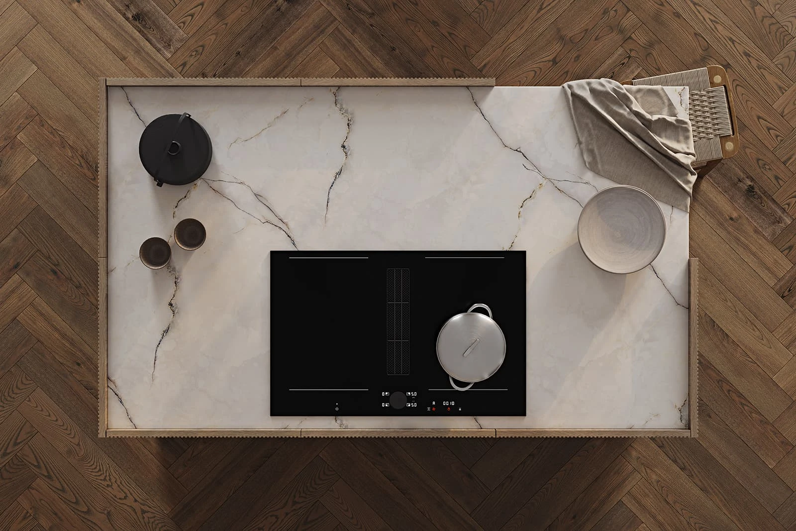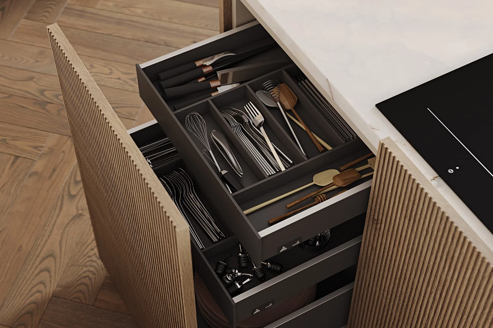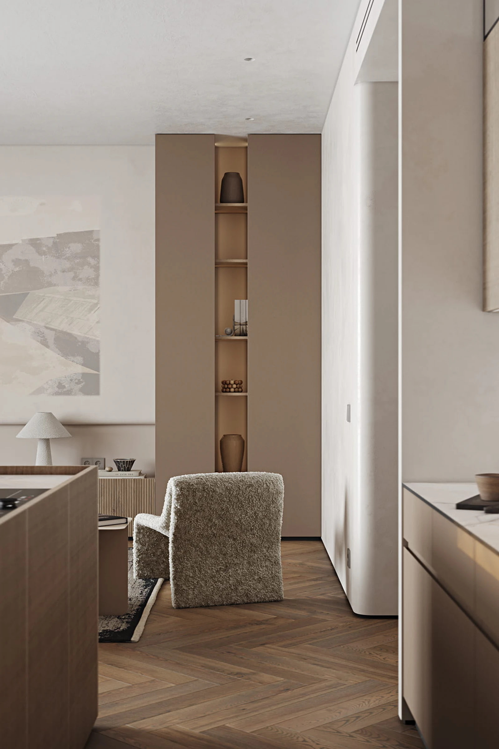 ФАСАДЫ Т440 Шпон дуба, цвет #189 (воскобейц Белый) / акрил FENIX NTM, цвет Серо-бежевый NTM (0748) / крашеная МДФ, цвет NCS S 5010-Y50R Матовый СТОЛЕШНИЦА Компакт-плита, 12 мм, декор Миони / пластик HPL, 38 мм, декор Миони