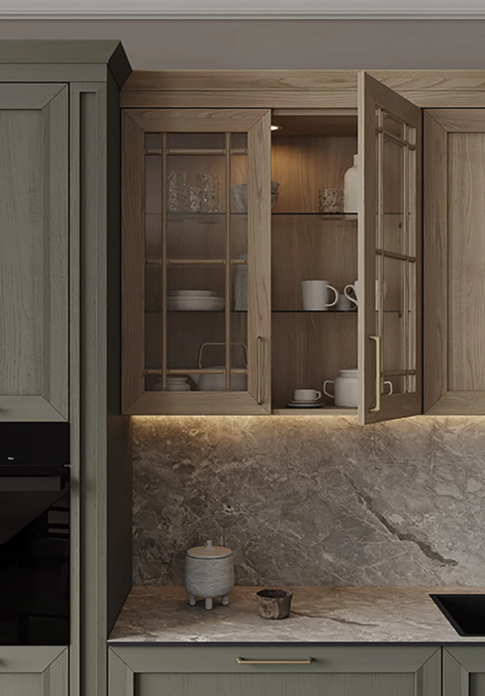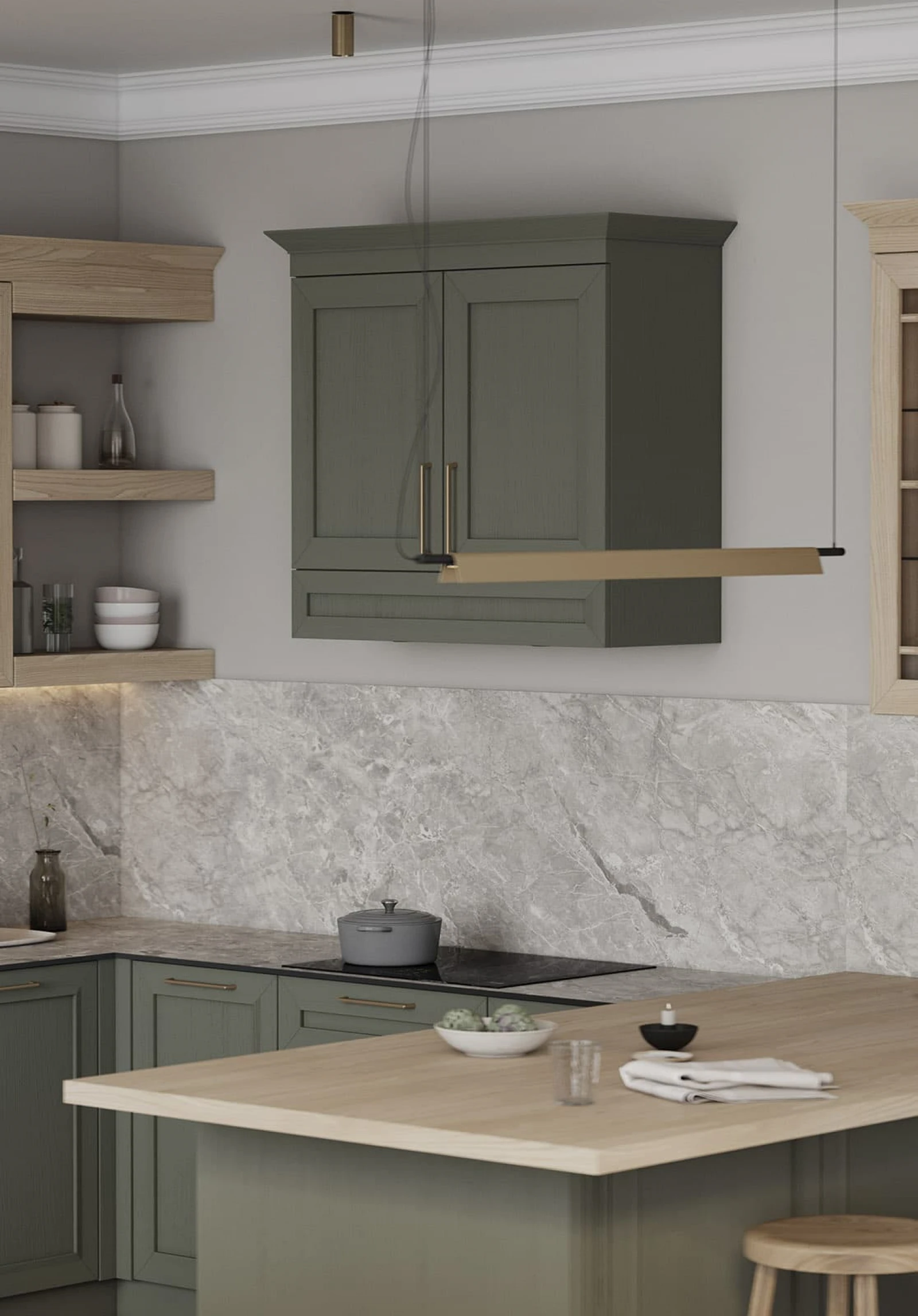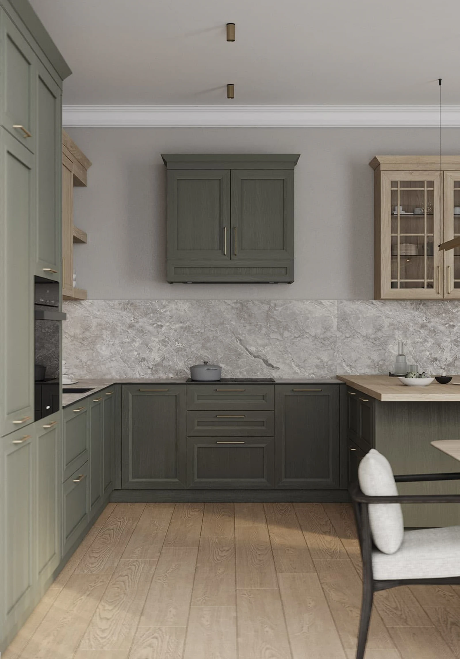 ФАСАДЫ Т763 Натуральный дуб, цвет NCS S 6010-G50Y / #183 (масловоск Бесцветный) СТОЛЕШНИЦА Компакт-плита, 12 мм, декор Римский Камень / КС массив дуба, 38 мм, цвет #183 (масловоск Бесцветный)