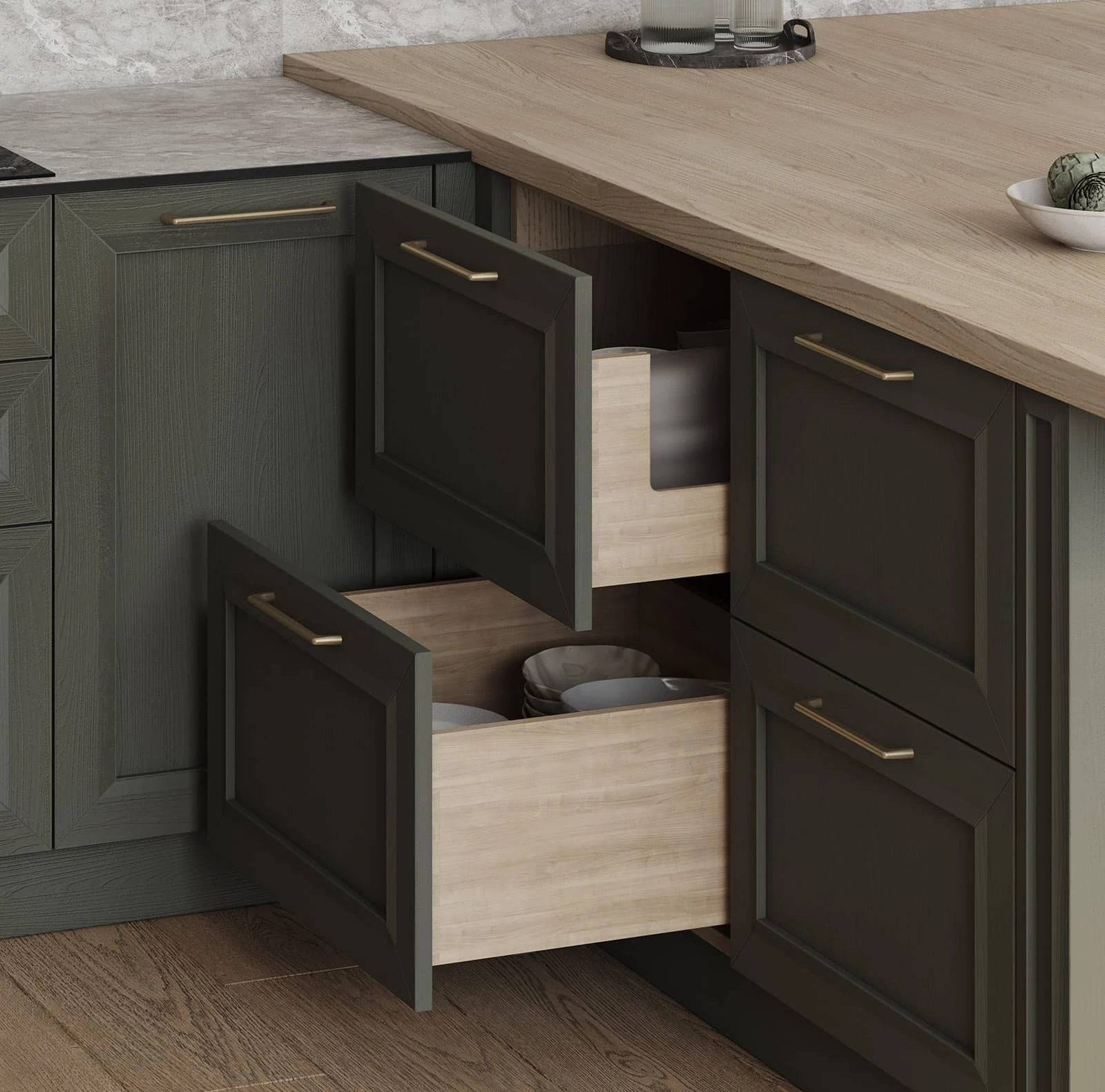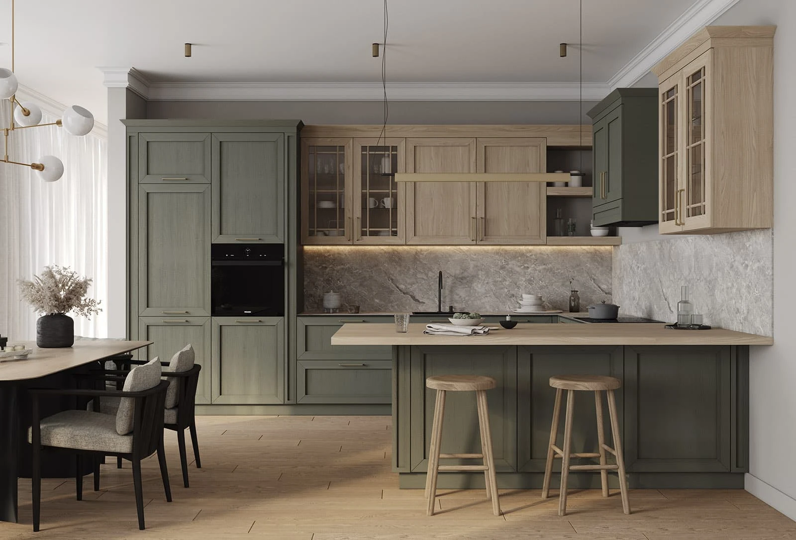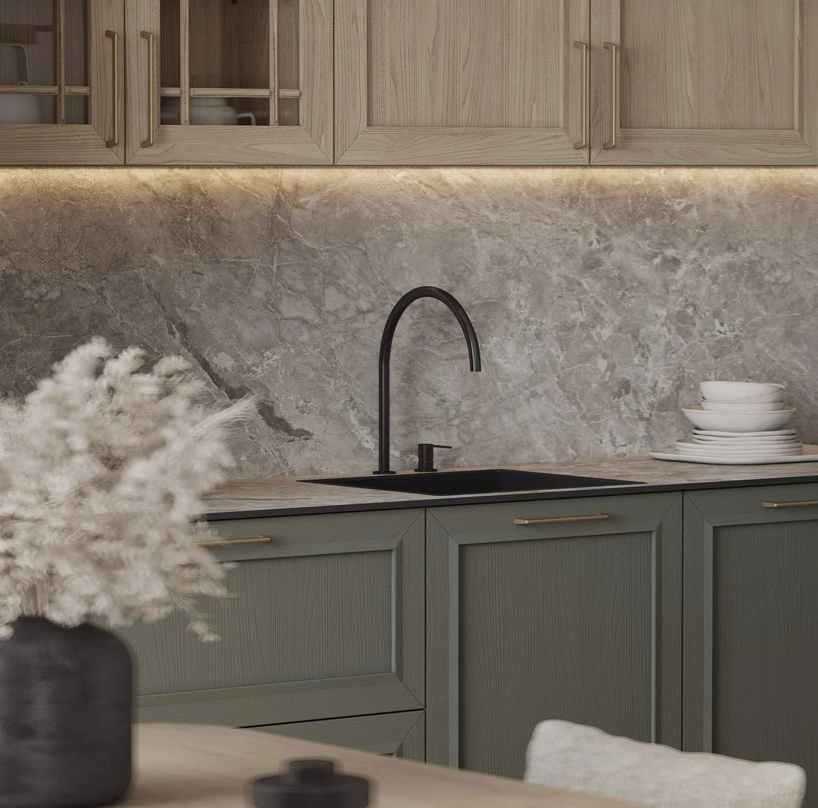 ФАСАДЫ Т763 Натуральный дуб, цвет NCS S 6010-G50Y / #183 (масловоск Бесцветный) СТОЛЕШНИЦА Компакт-плита, 12 мм, декор Римский Камень / КС массив дуба, 38 мм, цвет #183 (масловоск Бесцветный)