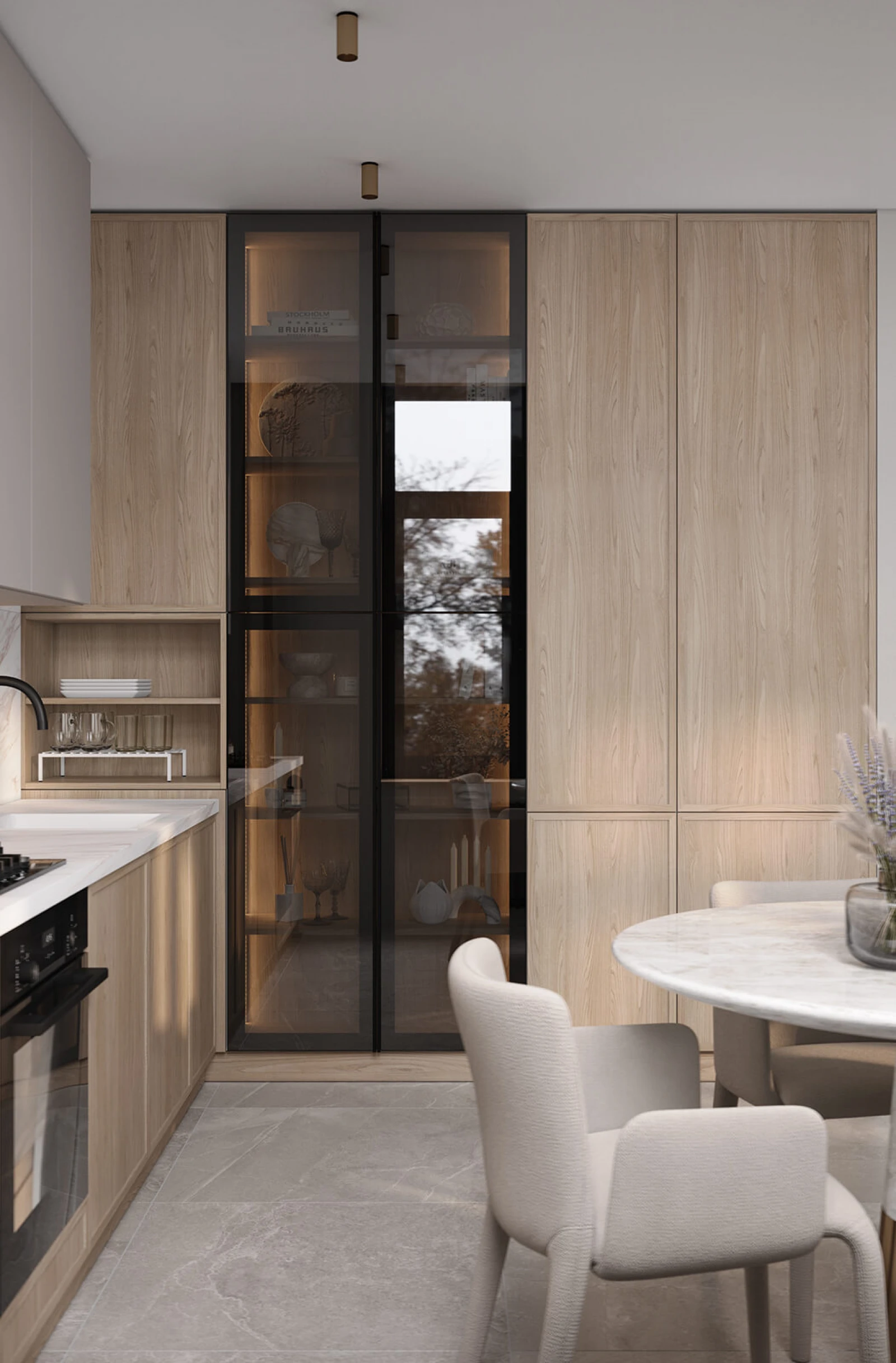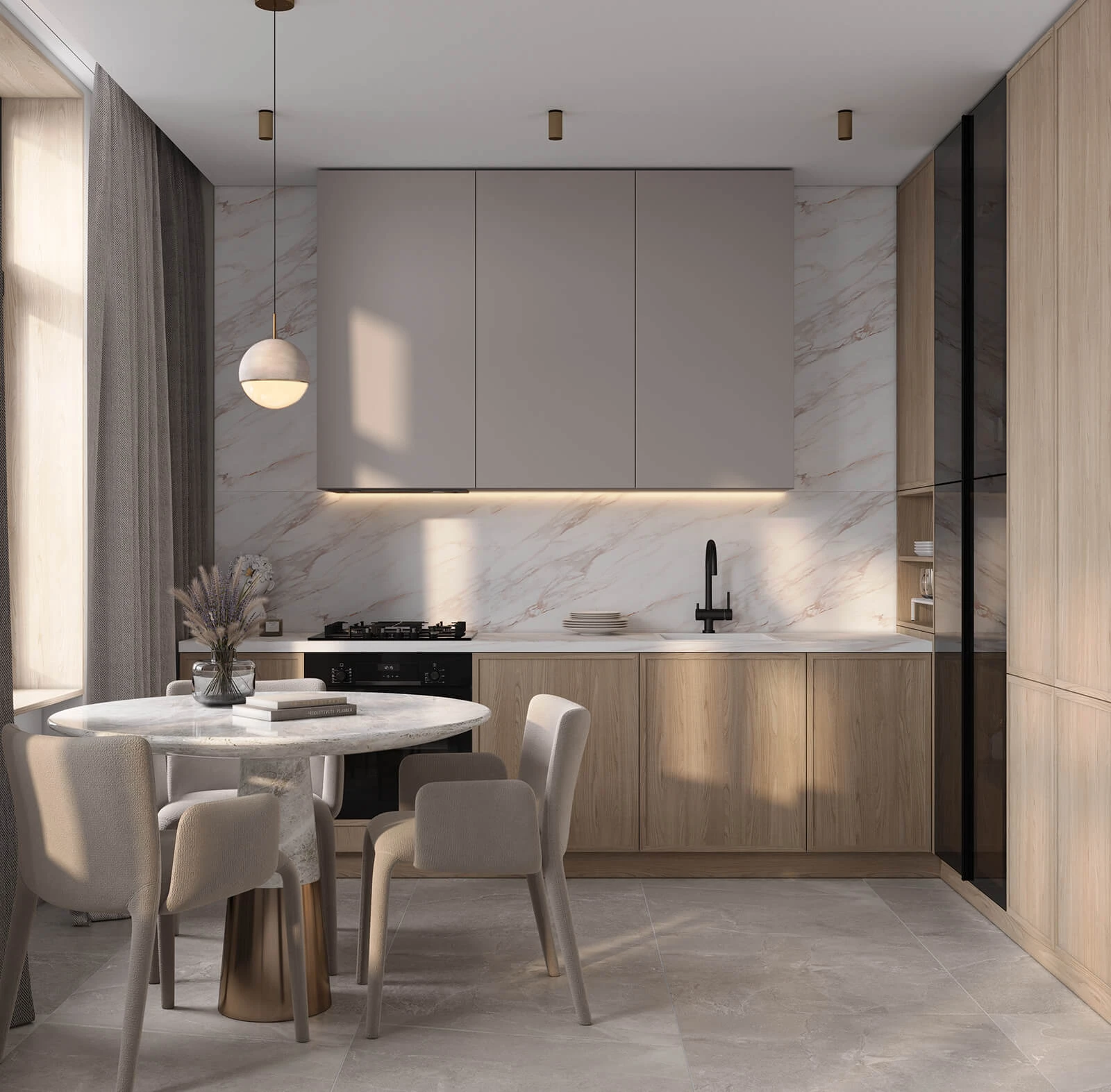 ФАСАДЫ Т431В Шпон дуба, цвет #189 (воскобейц Белый) / акрил Fenix NTM, цвет Серо-бежевый NTM (0748) СТОЛЕШНИЦА Пластик HPL, 38 мм, декор Энцо