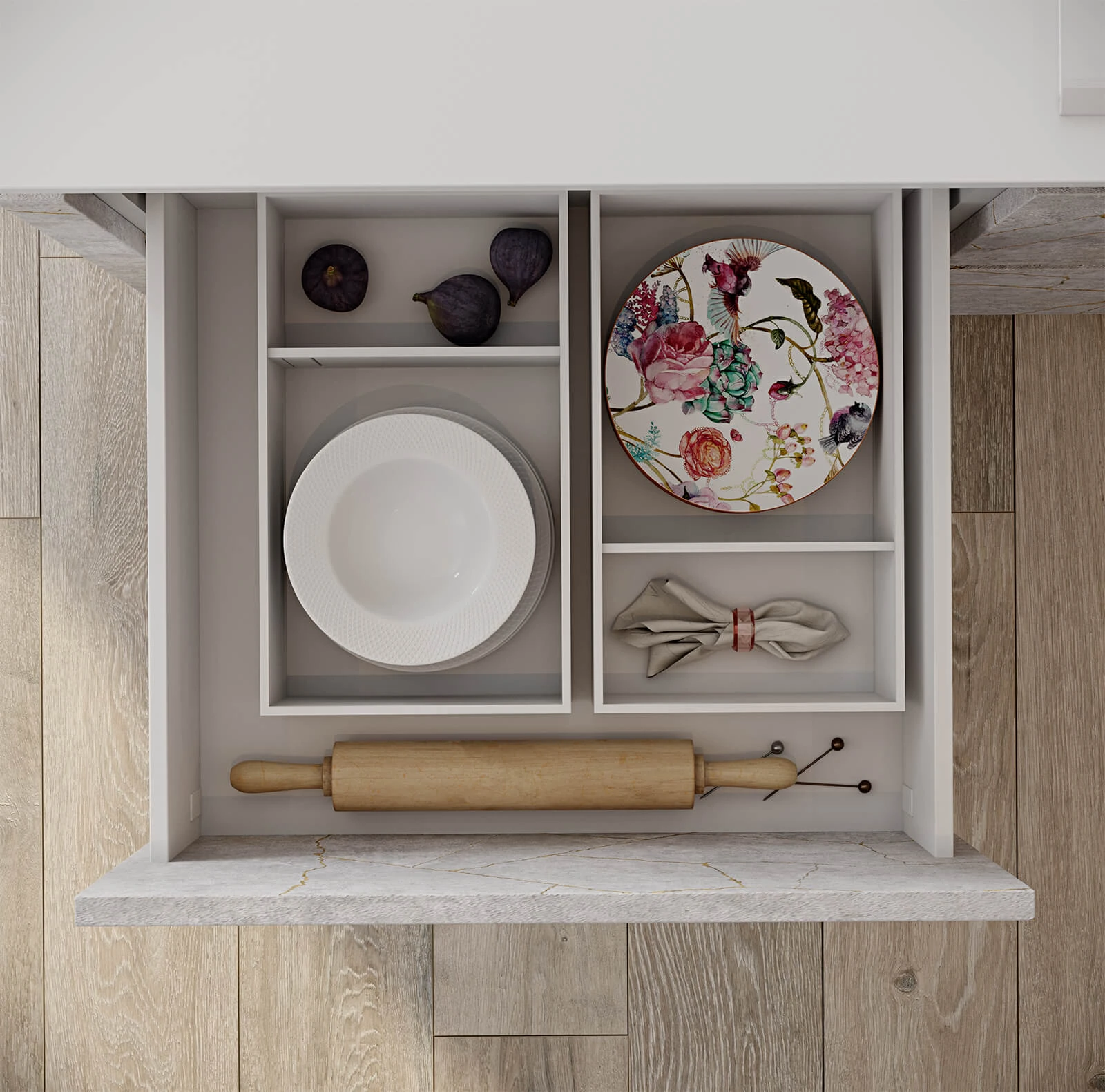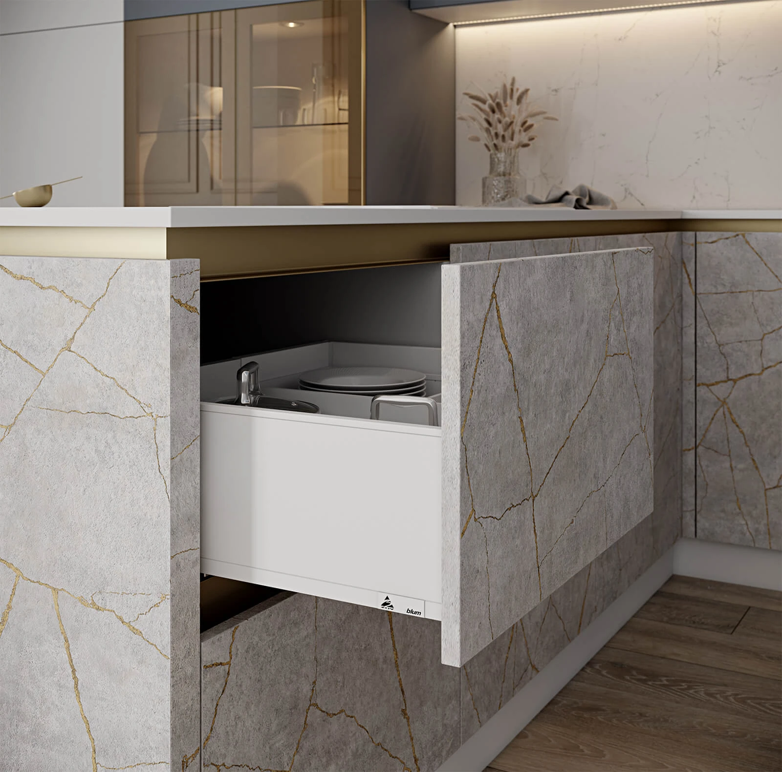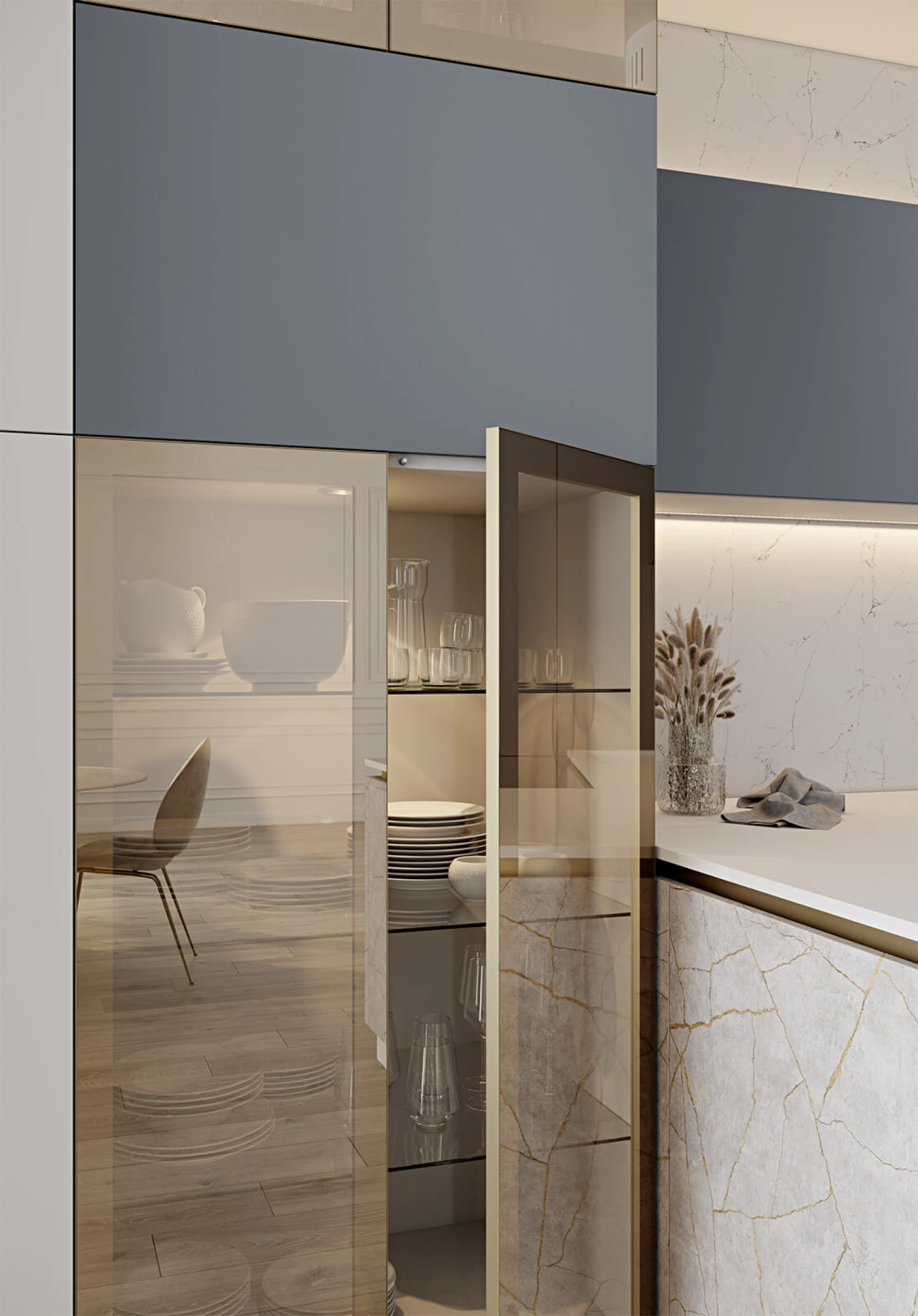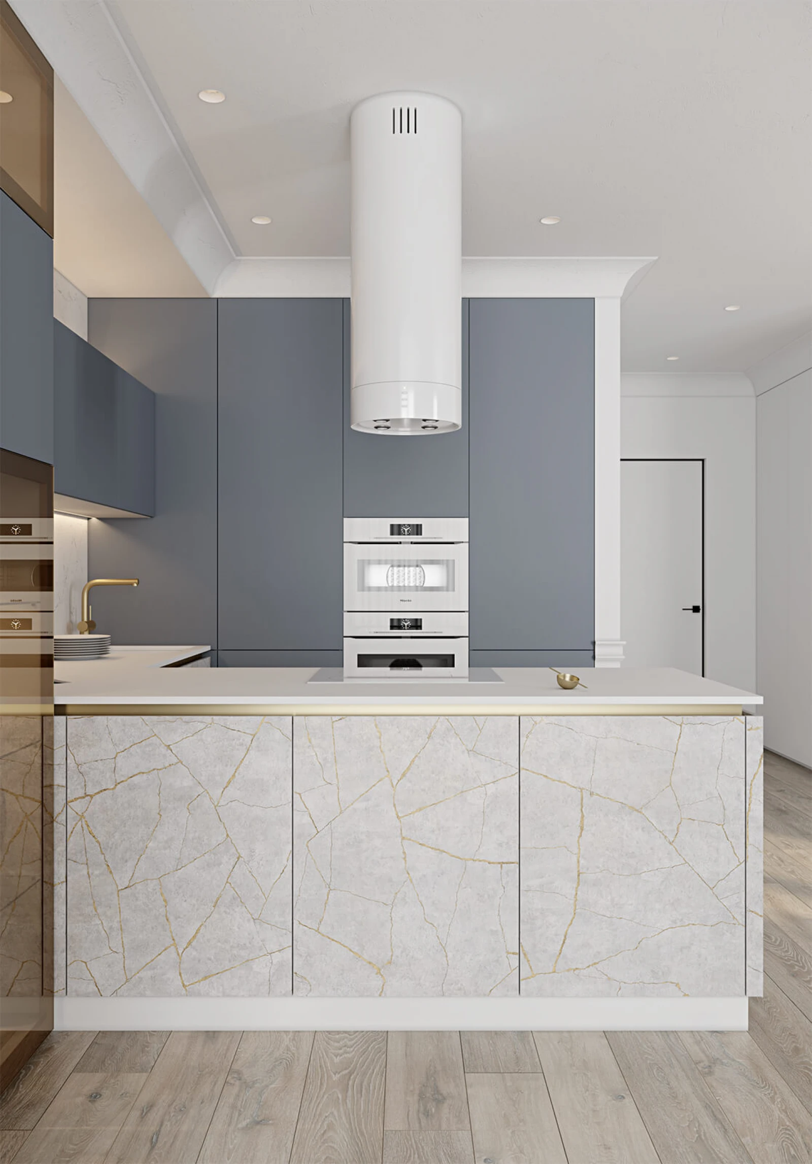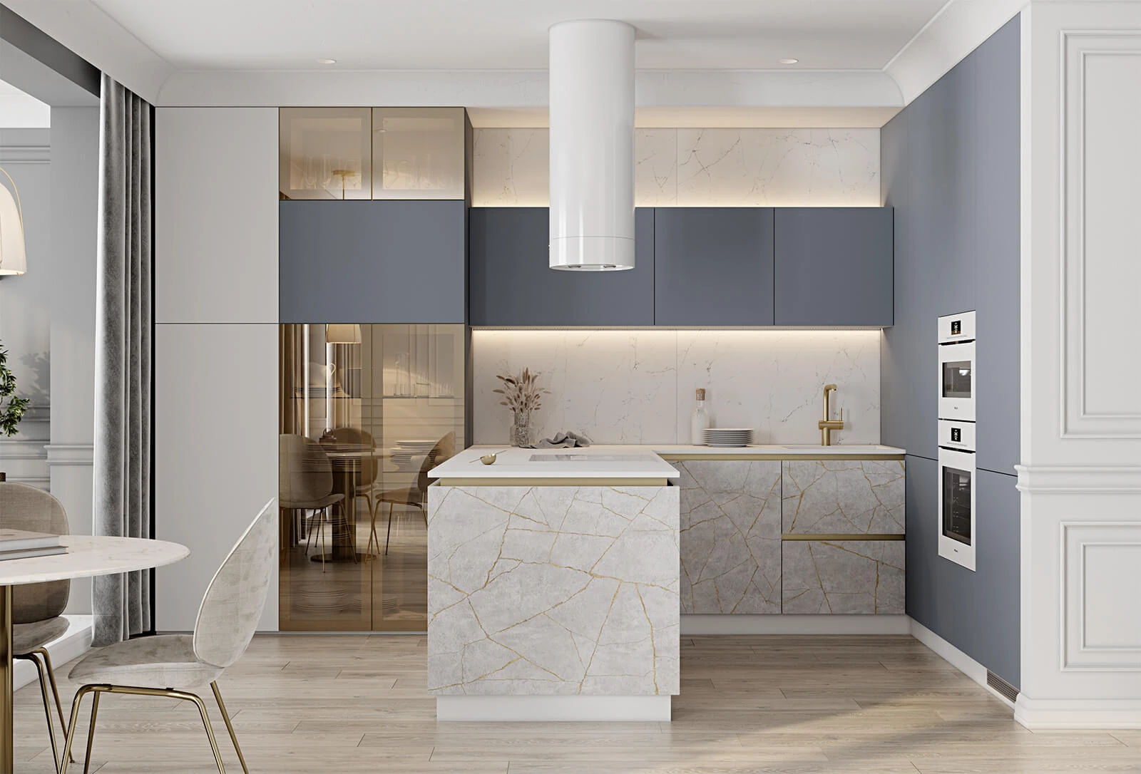 ФАСАДЫ ЛДСП 18 мм / крашеная МДФ, цвет NCS S 4020-R90B Матовый / акрил Fenix NTM, цвет Белый NTM (0032) СТОЛЕШНИЦА Акрил Fenix NTM, 20 мм, цвет Белый NTM (0032)